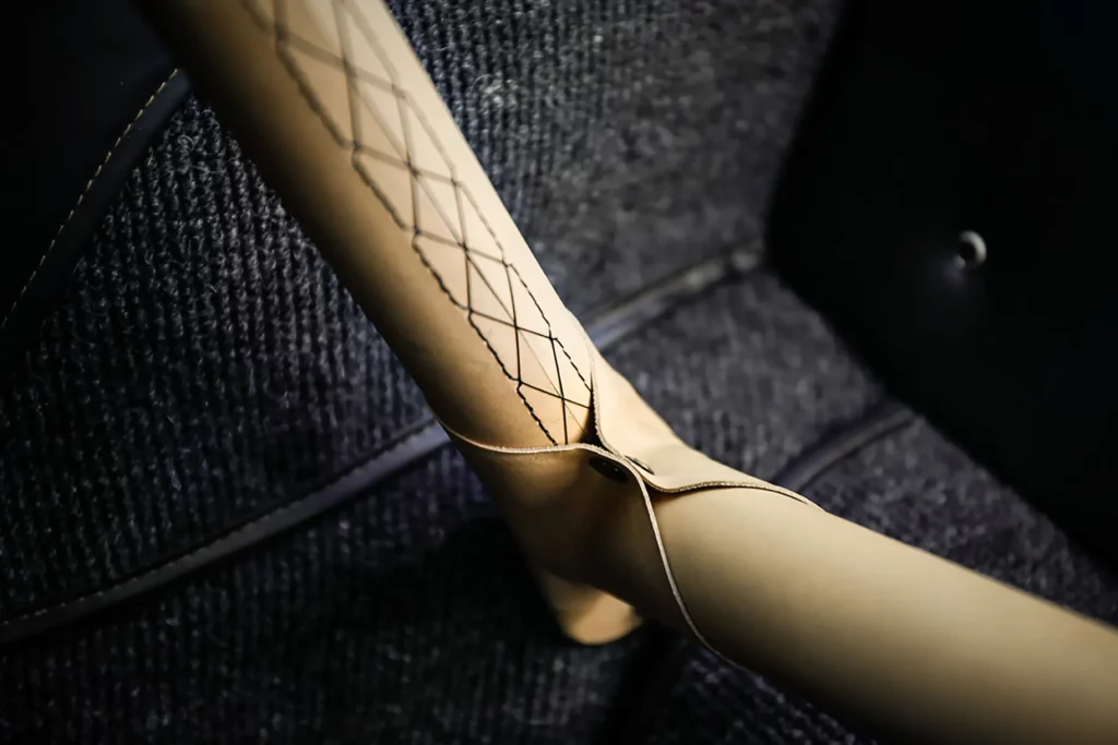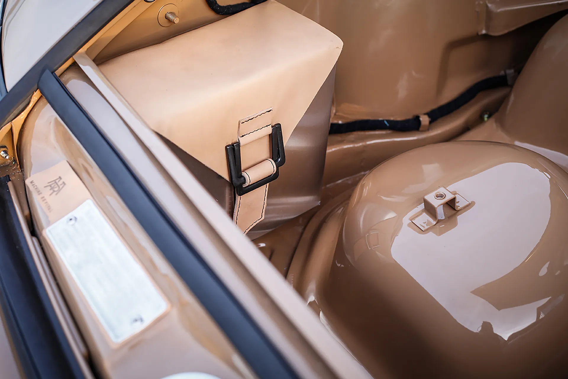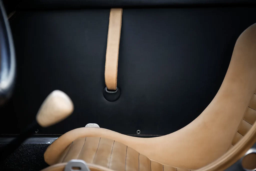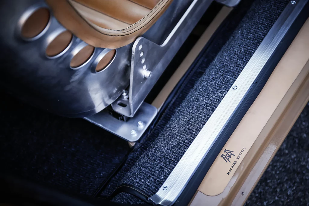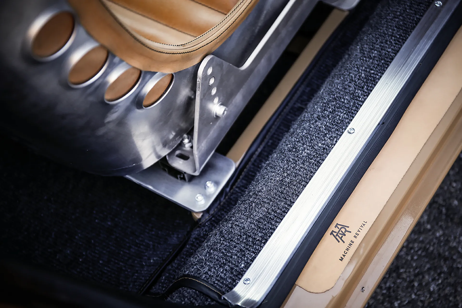 Aesthetically uncompromising, Nemesis wears a tone-on-tone sand beige finish from bodywork to engine bay, emphasizing its clean, purposeful lines. Inside, the cabin is stripped to its essentials: patinated leather, exposed metal, and brushed aluminum evoke a race-bred atmosphere. There are no driving aids. This car demands respect — and offers no mercy to those who underestimate it.