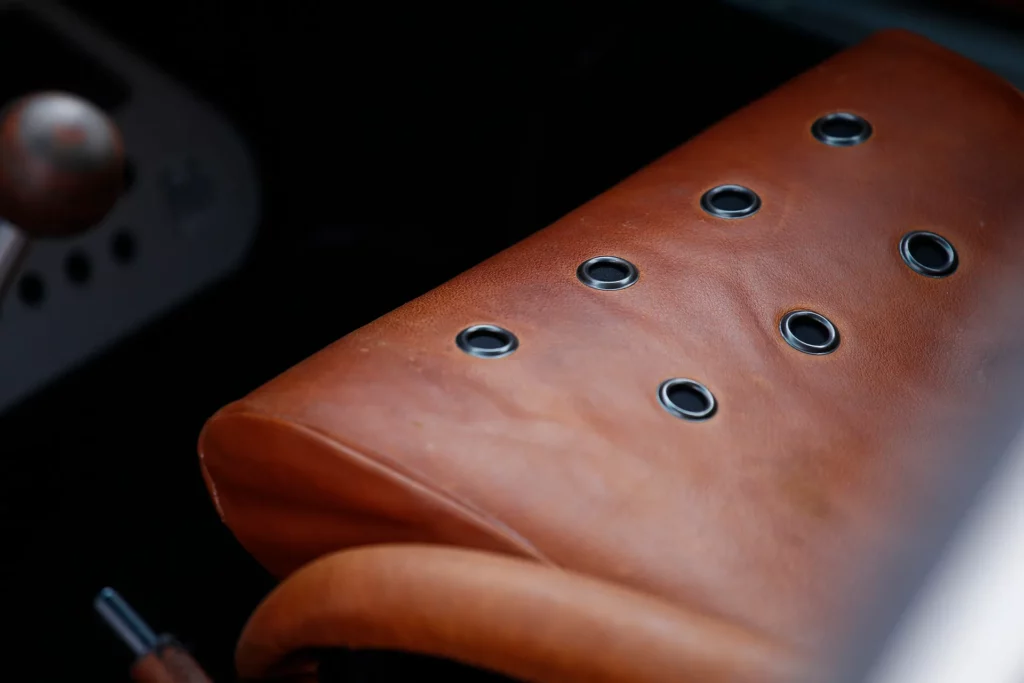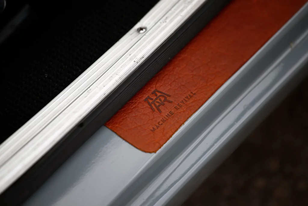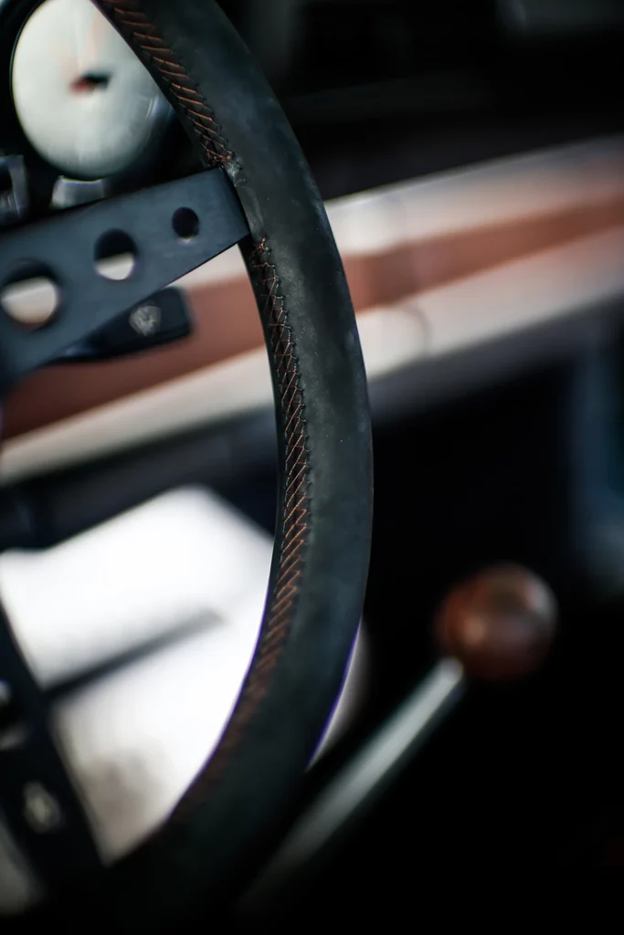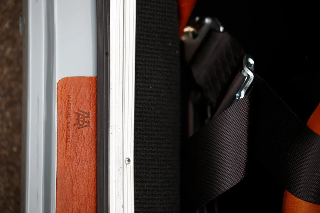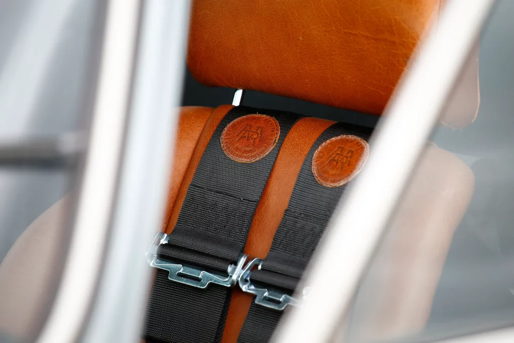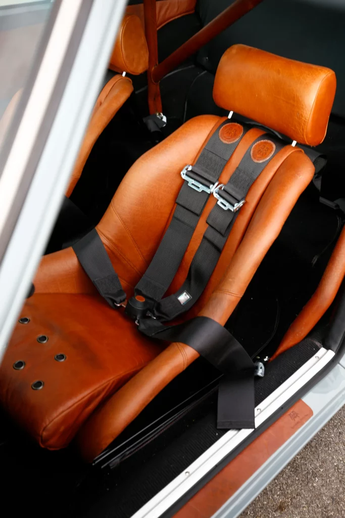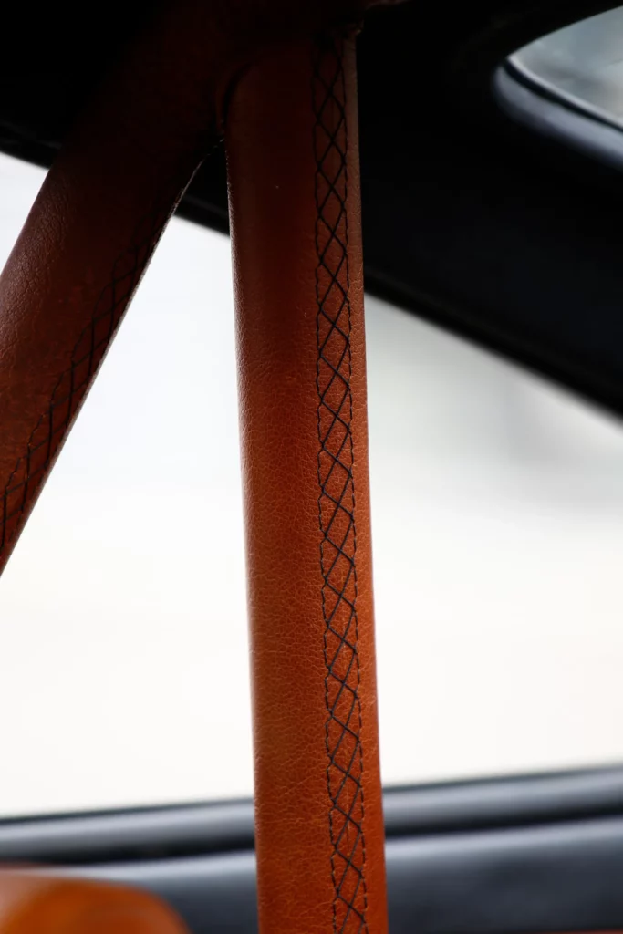 On the outside, a matte Sanctuary Grey finish evokes the sobriety of cult machines. Inside, everything is crafted as an altar dedicated to touch, sight, and smell: hand-stitched buffalo leather even on the roll cage, upholstery fully handmade, with raw materials such as metal, leather, fiberglass, and aluminum. A bold contrast between the austere exterior and rich sensory interior.