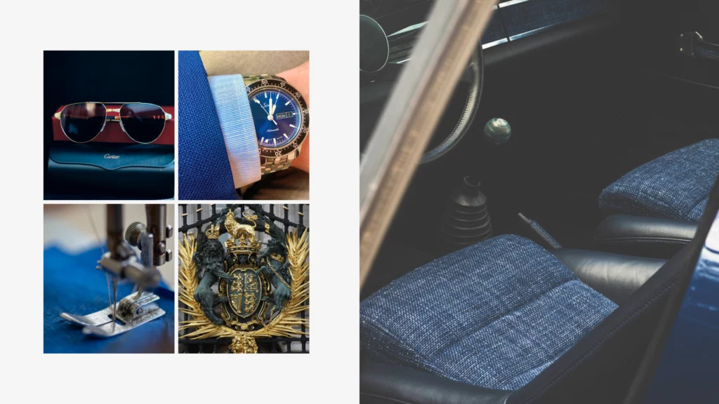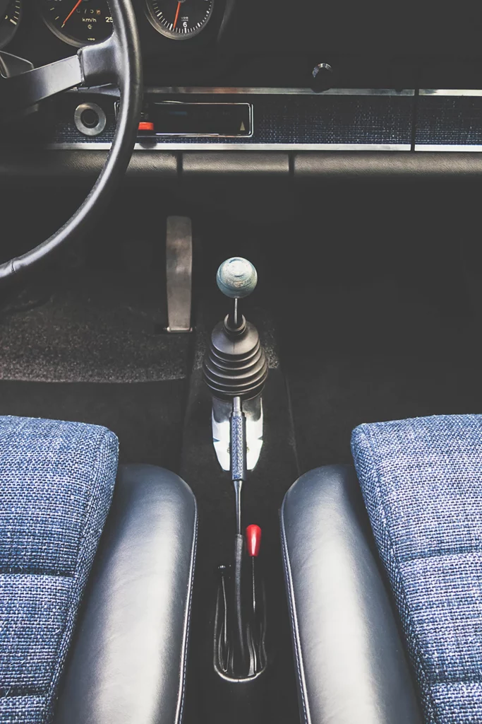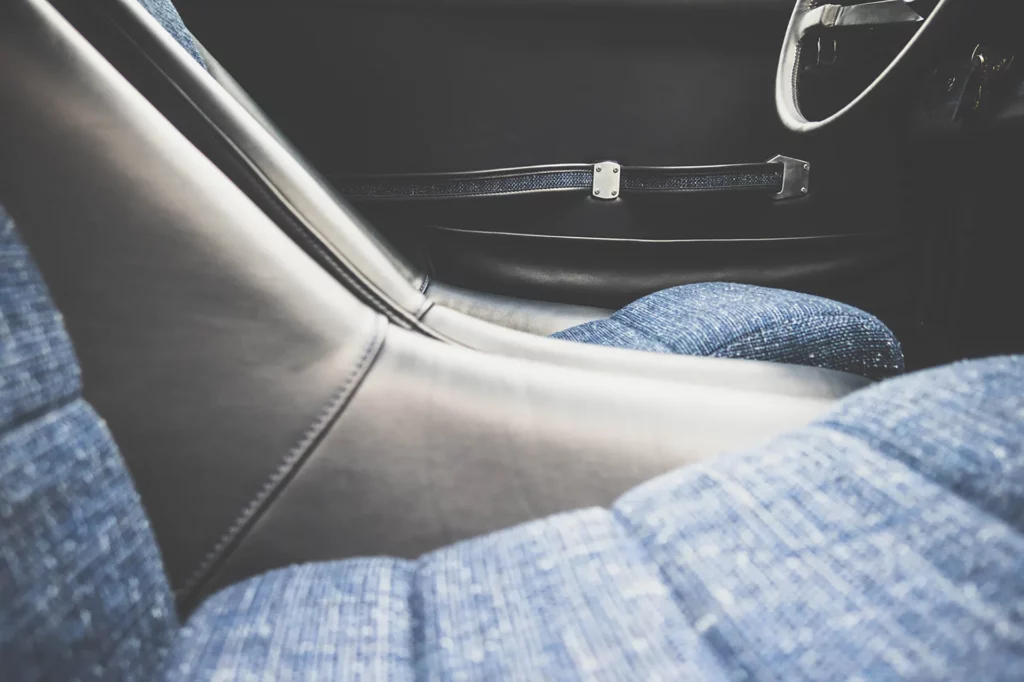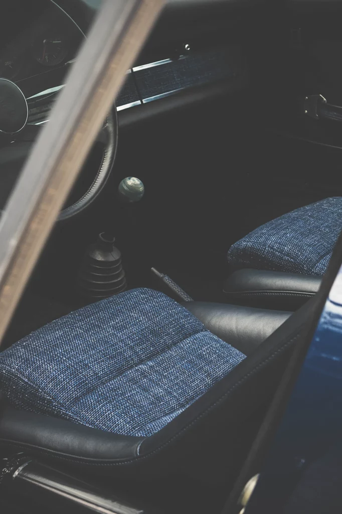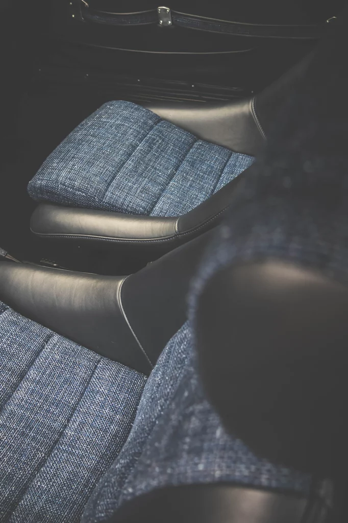 Its subtly reworked Regency Blue coat evokes the metallic chill of cobalt and the depth of a stormy sky. Inside, every texture has meaning: a custom-woven blue fabric reminiscent of raw denim, deep blue leather paired with refined black panels, and a gear knob crafted from wood and matching tones. The seat stitching and textile gradients are masterfully detailed, while cold aluminum trims cut through the softness — a bold signature of restrained luxury. The result is an interior of quiet complexity.