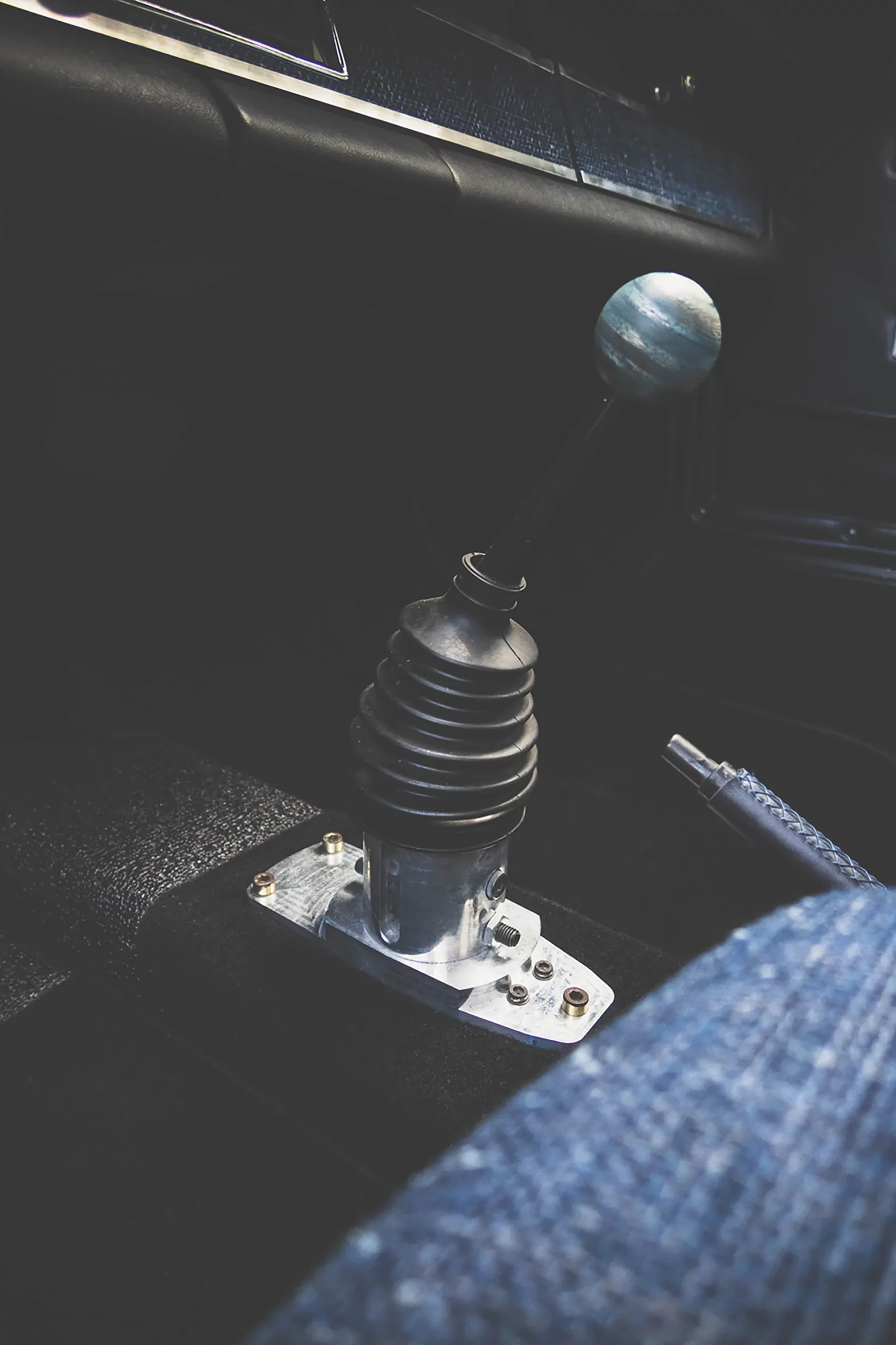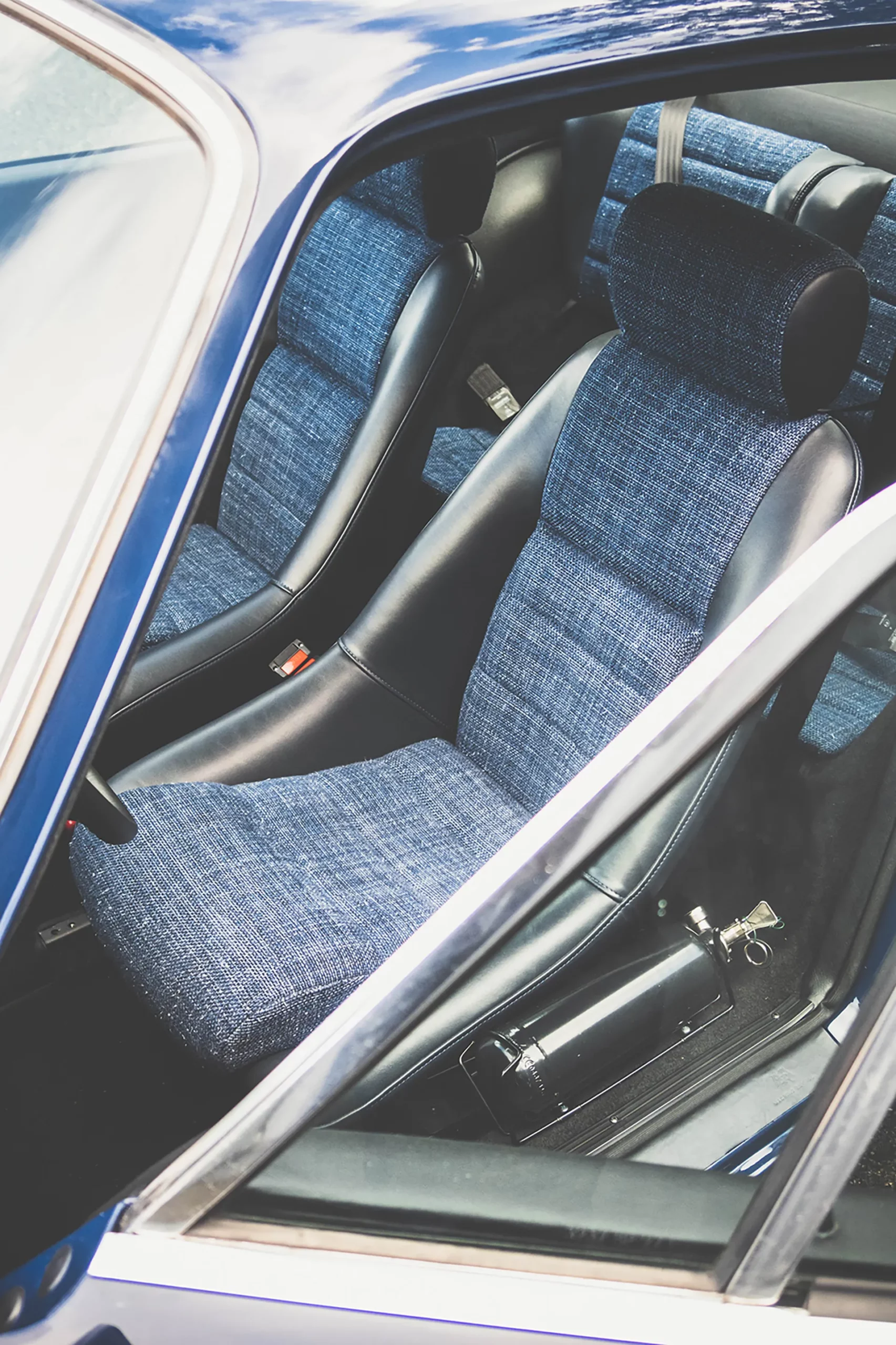 Its subtly reworked Regency Blue coat evokes the metallic chill of cobalt and the depth of a stormy sky. Inside, every texture has meaning: a custom-woven blue fabric reminiscent of raw denim, deep blue leather paired with refined black panels, and a gear knob crafted from wood and matching tones. The seat stitching and textile gradients are masterfully detailed, while cold aluminum trims cut through the softness — a bold signature of restrained luxury. The result is an interior of quiet complexity.