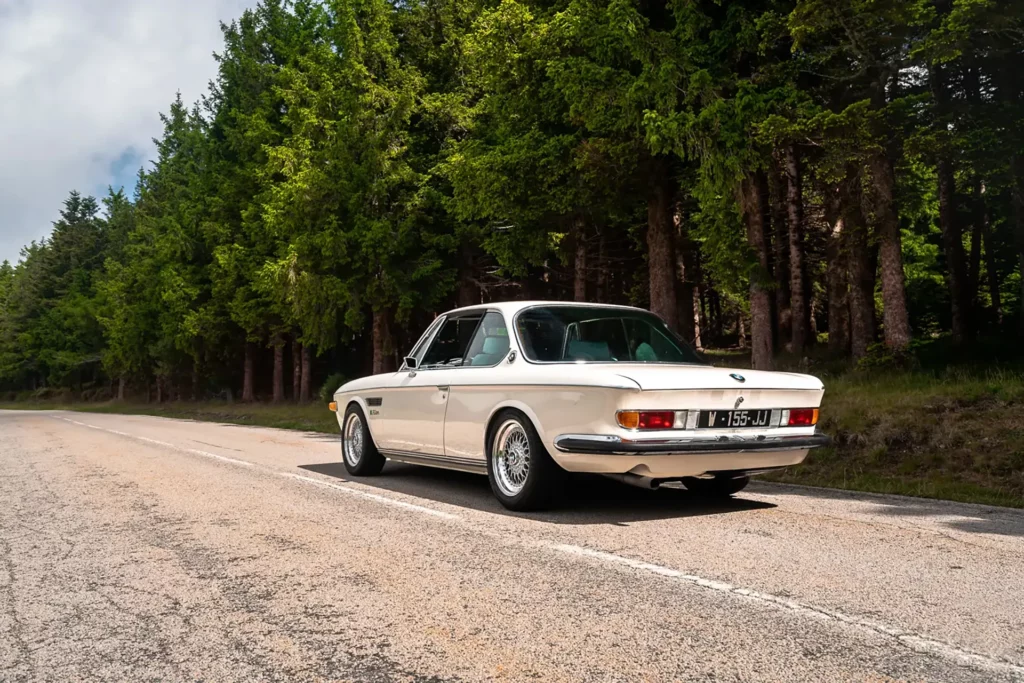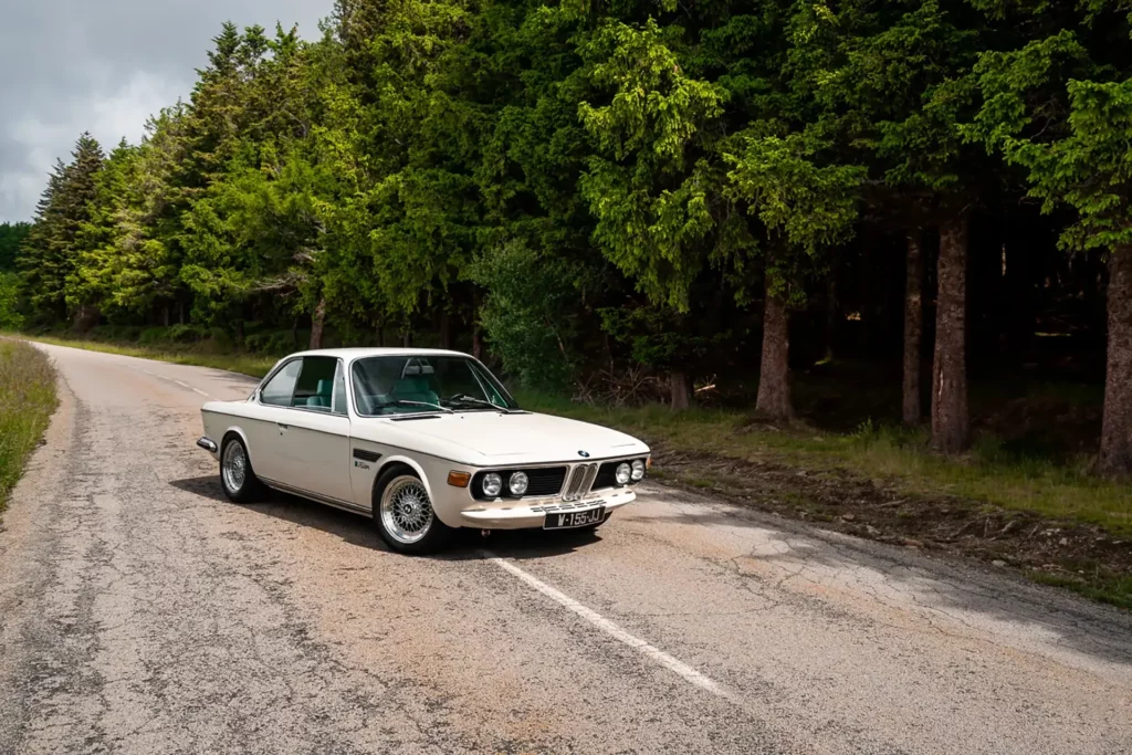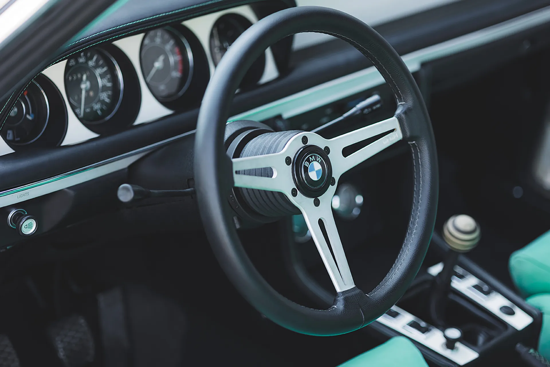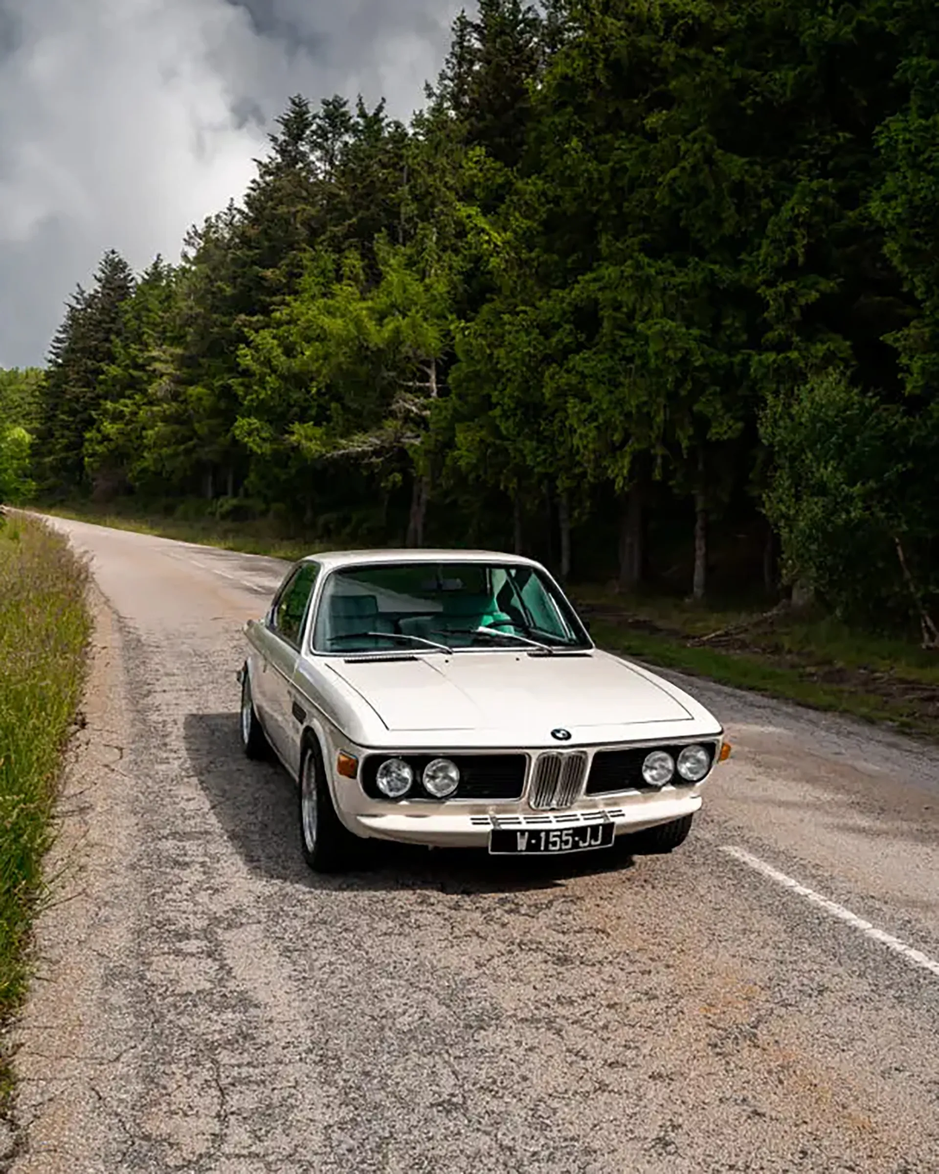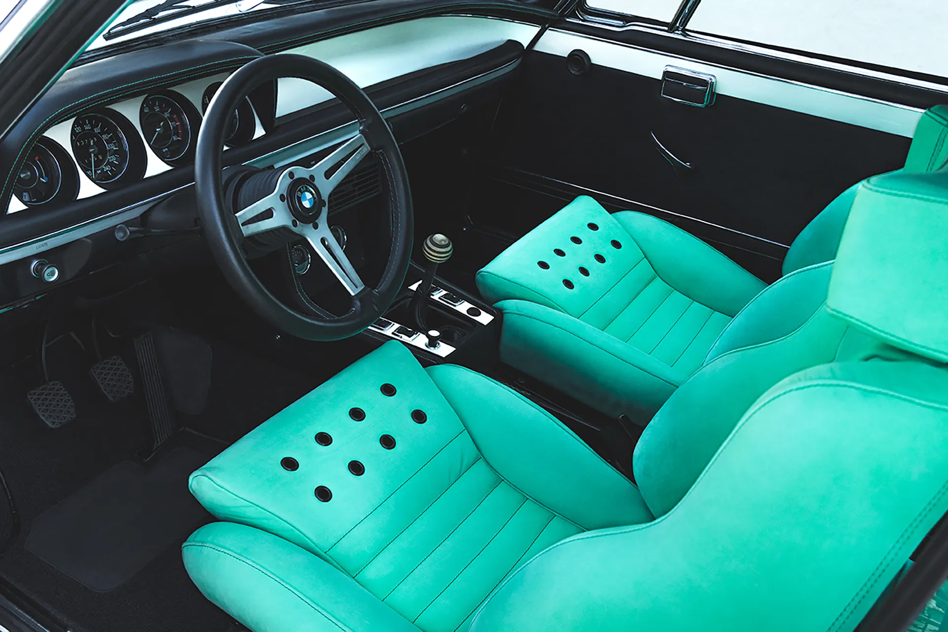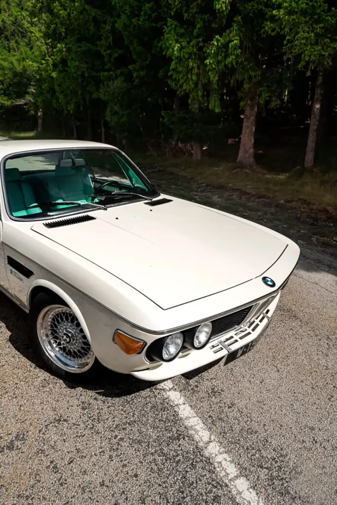 Brand: BMW | Model: 3.0 CS – E9 | Year: 1972 | Engine: 3.6L | Power: 315 HP | Weight: 1420 kg | Transmission: Manual | Color: Mythic White | Materials: Daim vert menthe, cuir noir et bois | Use: Daily