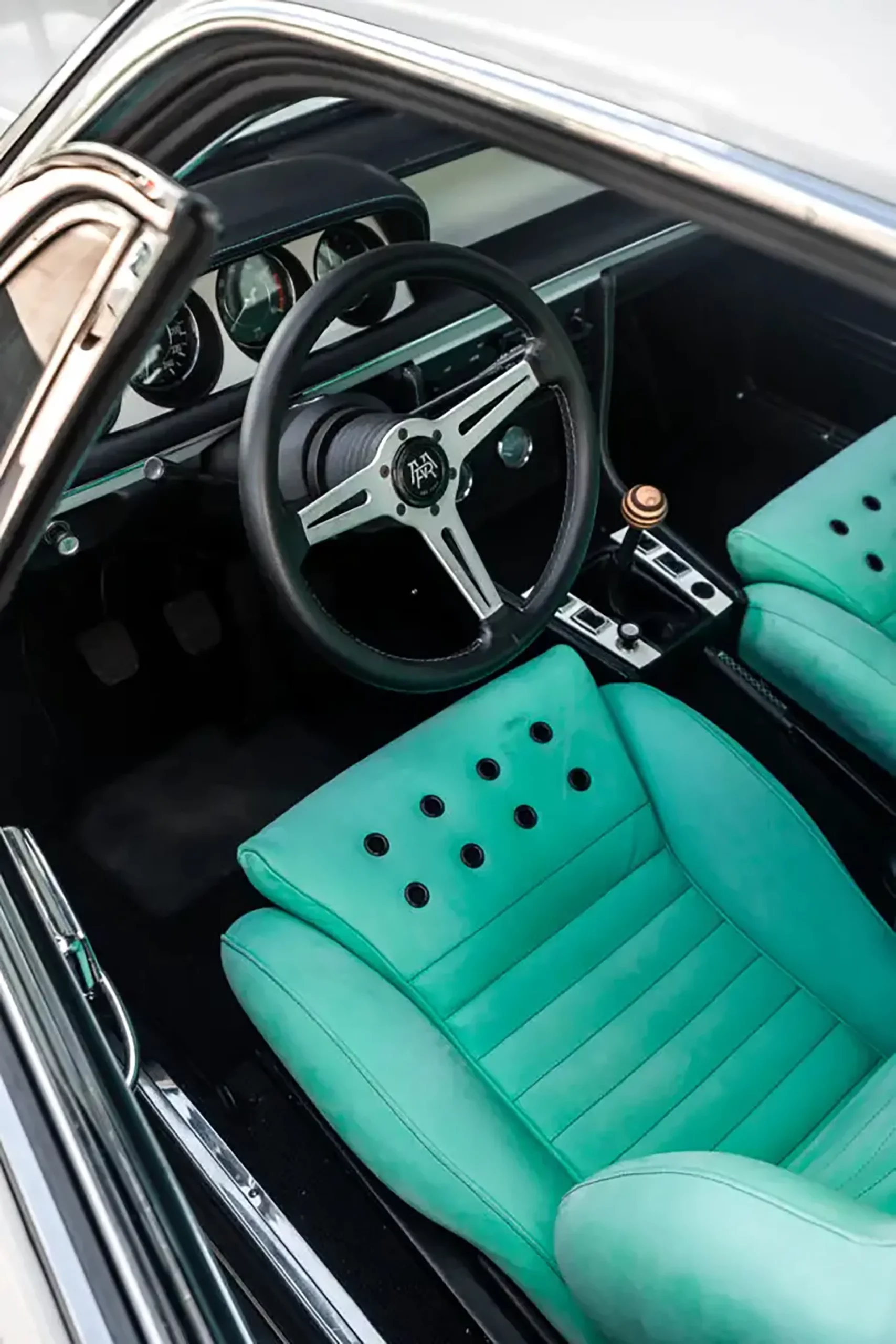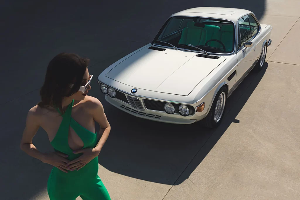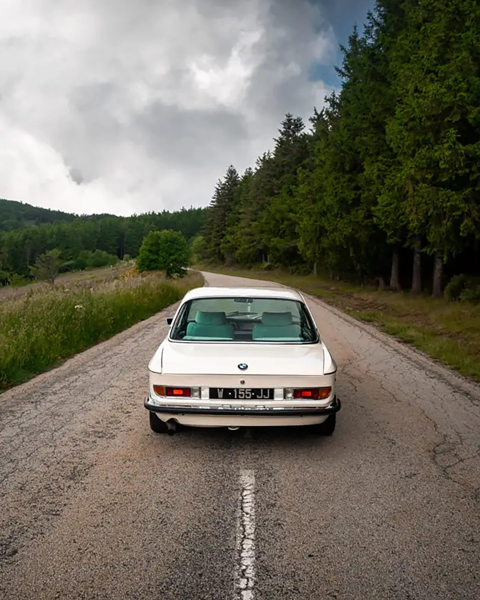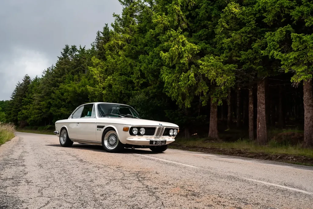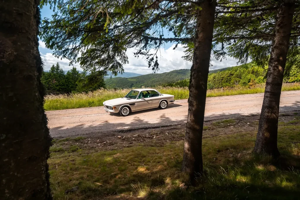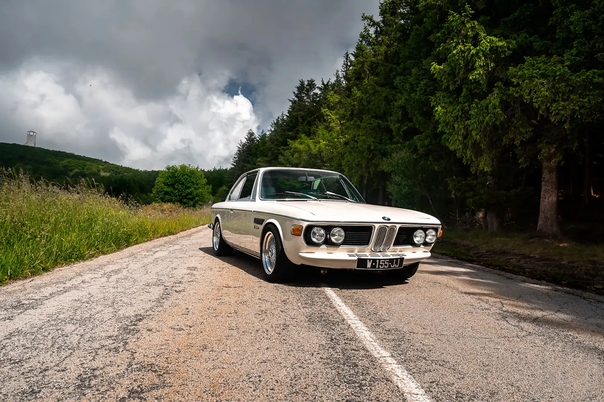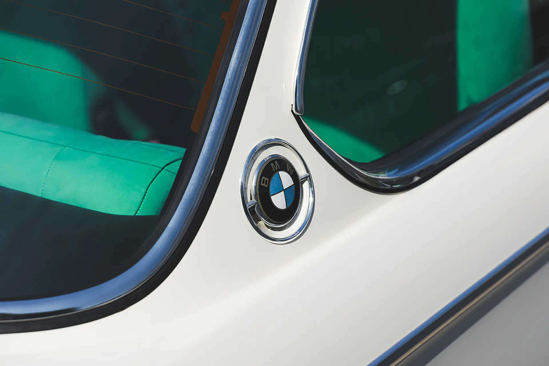 Brand: BMW | Model: 3.0 CS – E9 | Year: 1972 | Engine: 3.6L | Power: 315 HP | Weight: 1420 kg | Transmission: Manual | Color: Mythic White | Materials: Daim vert menthe, cuir noir et bois | Use: Daily