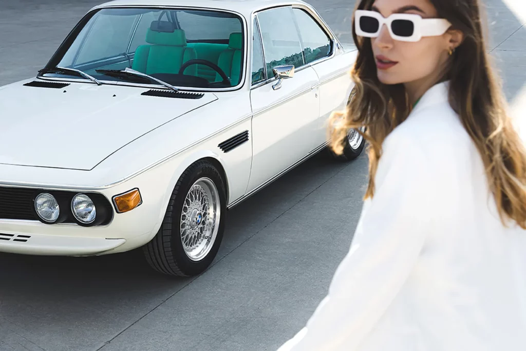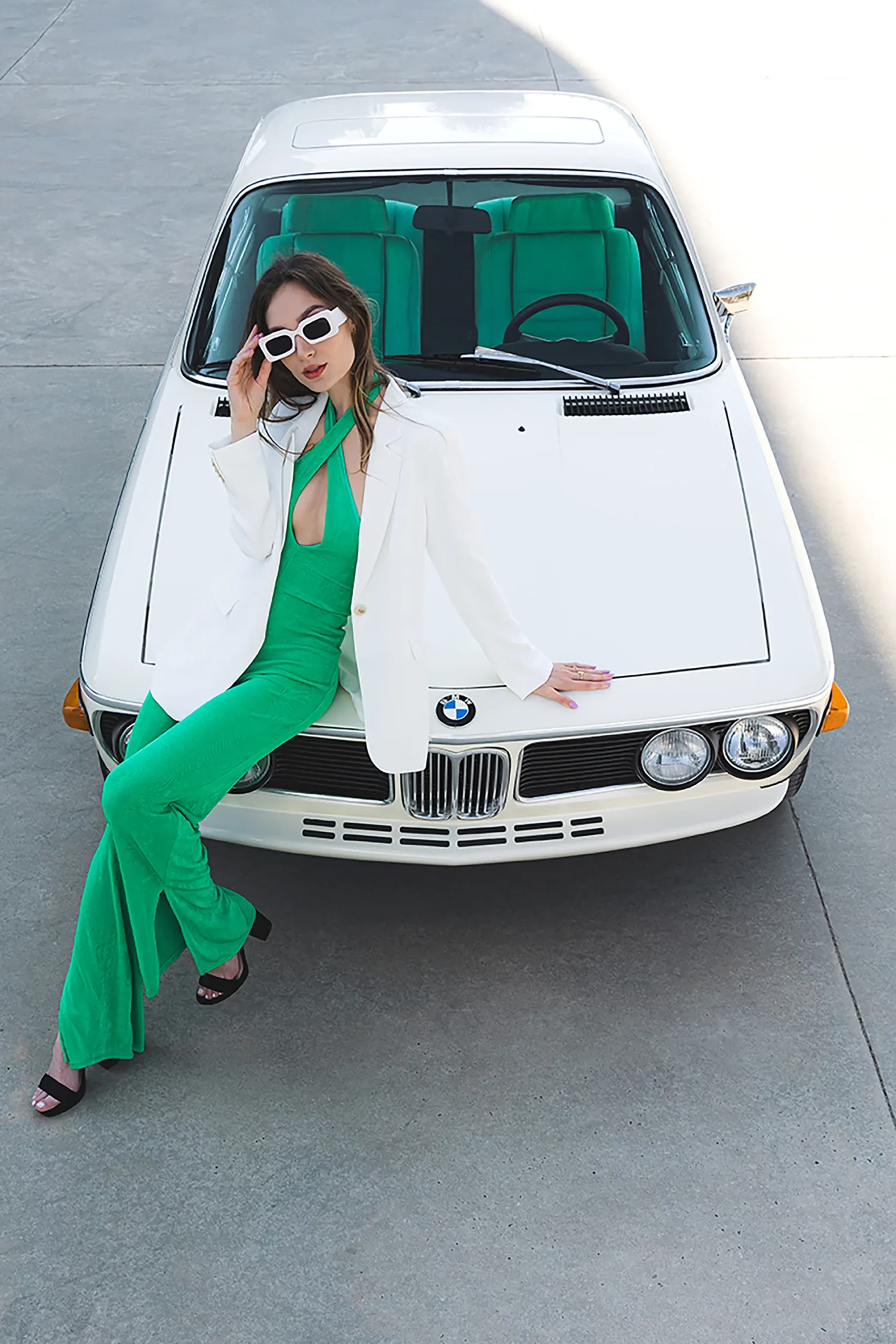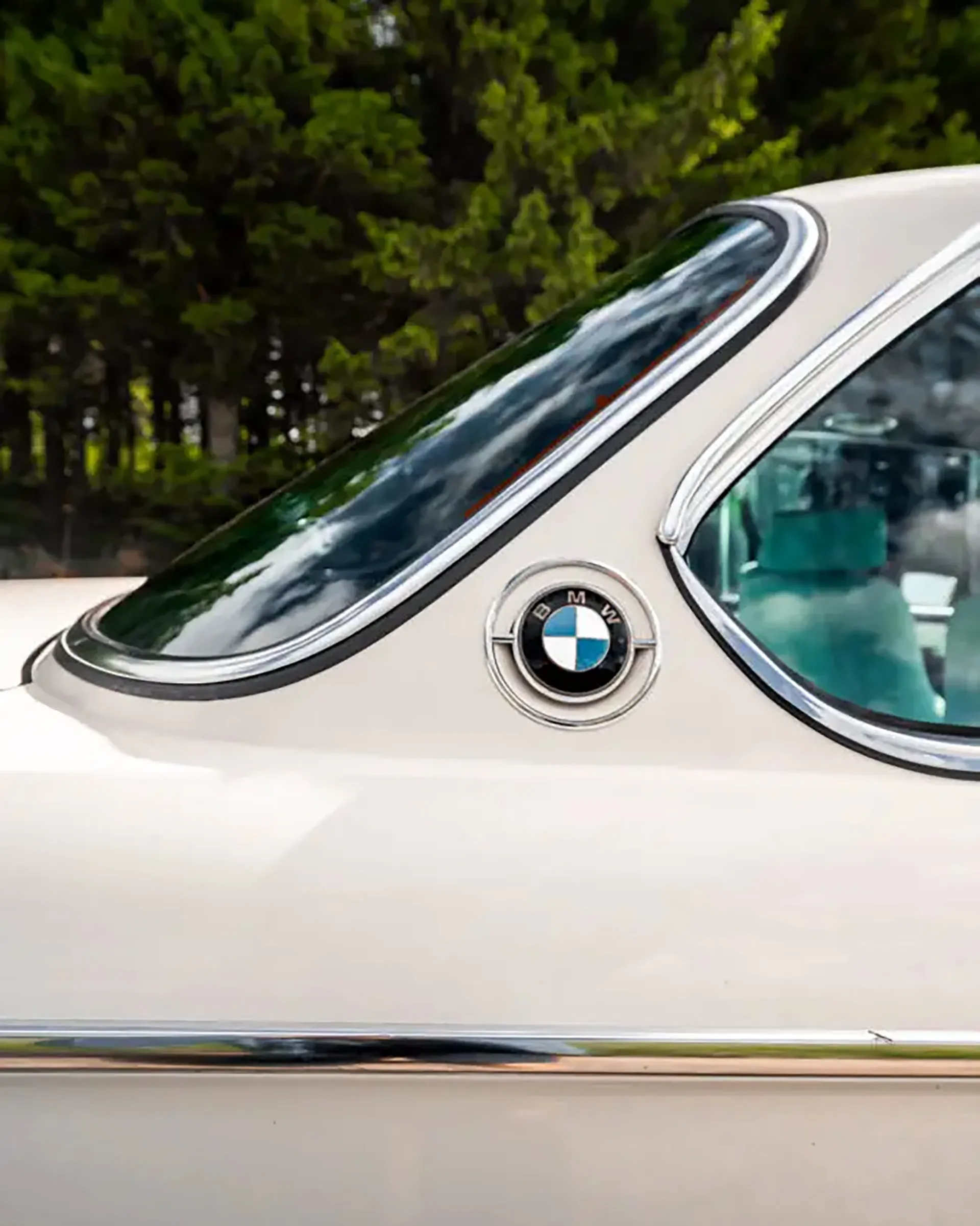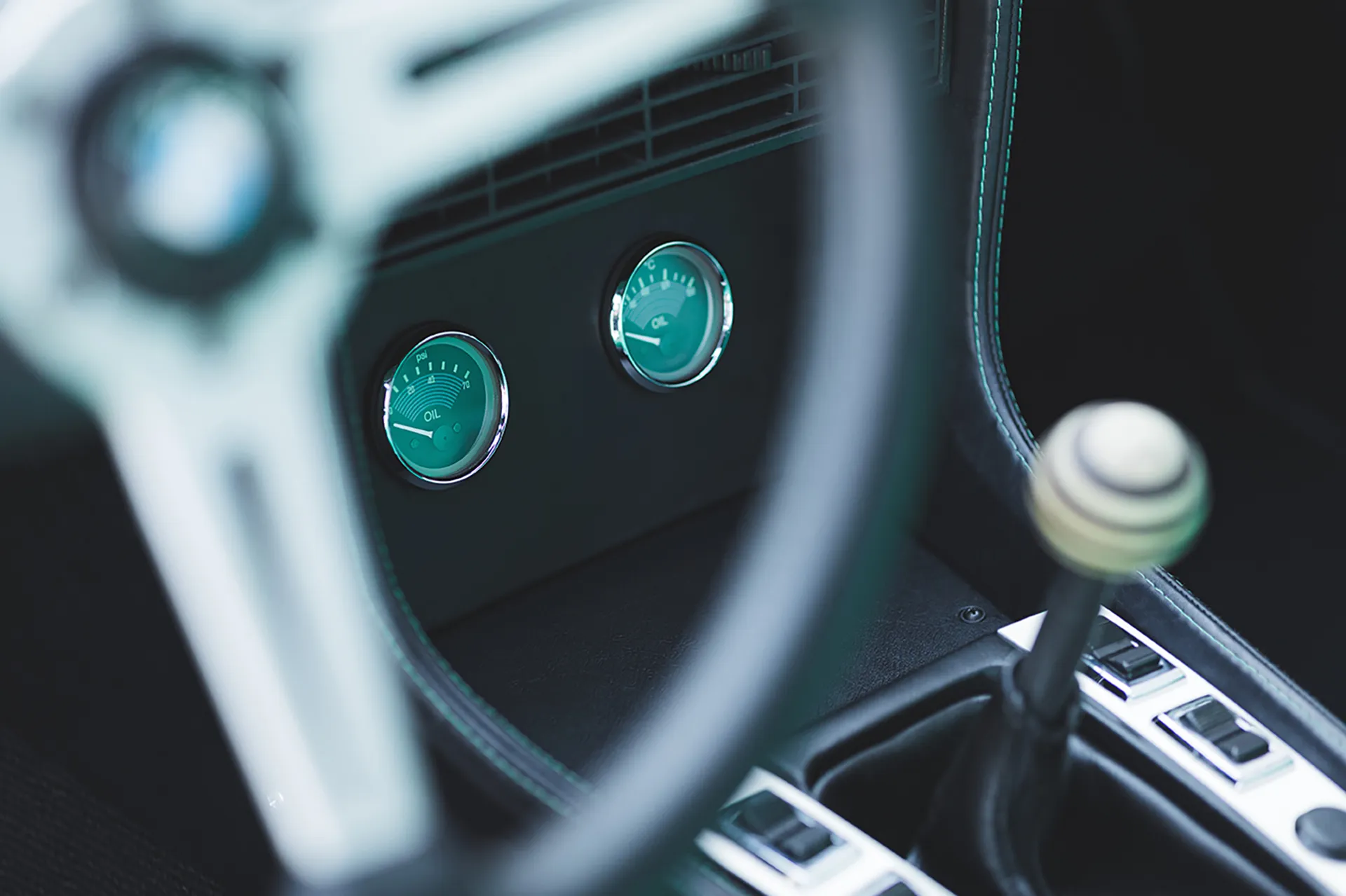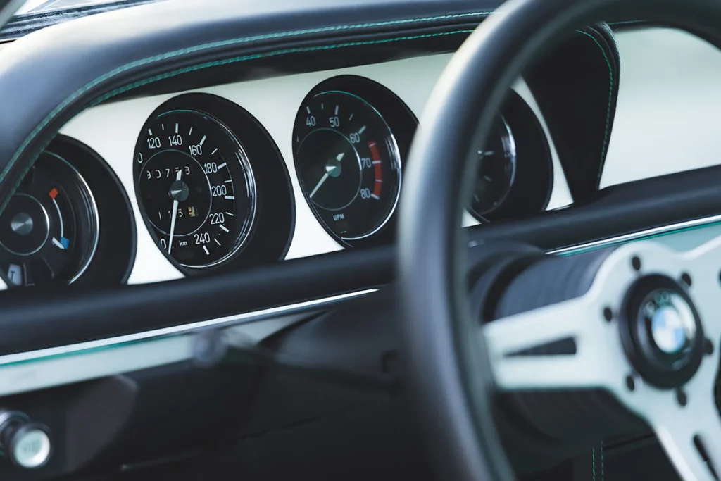 Brand: BMW | Model: 3.0 CS – E9 | Year: 1972 | Engine: 3.6L | Power: 315 HP | Weight: 1420 kg | Transmission: Manual | Color: Mythic White | Materials: Daim vert menthe, cuir noir et bois | Use: Daily