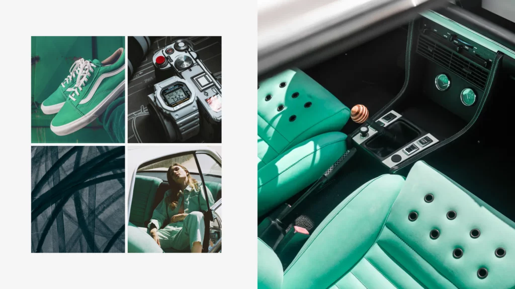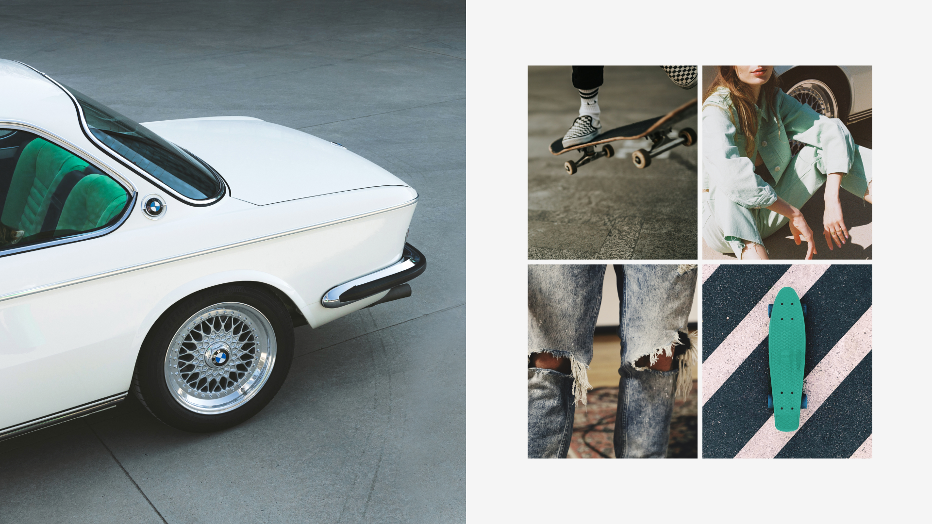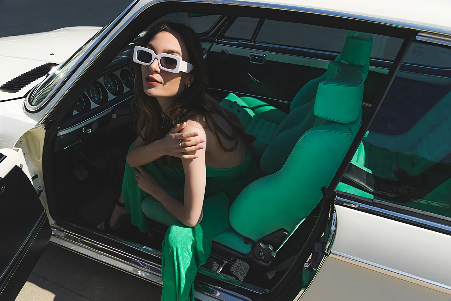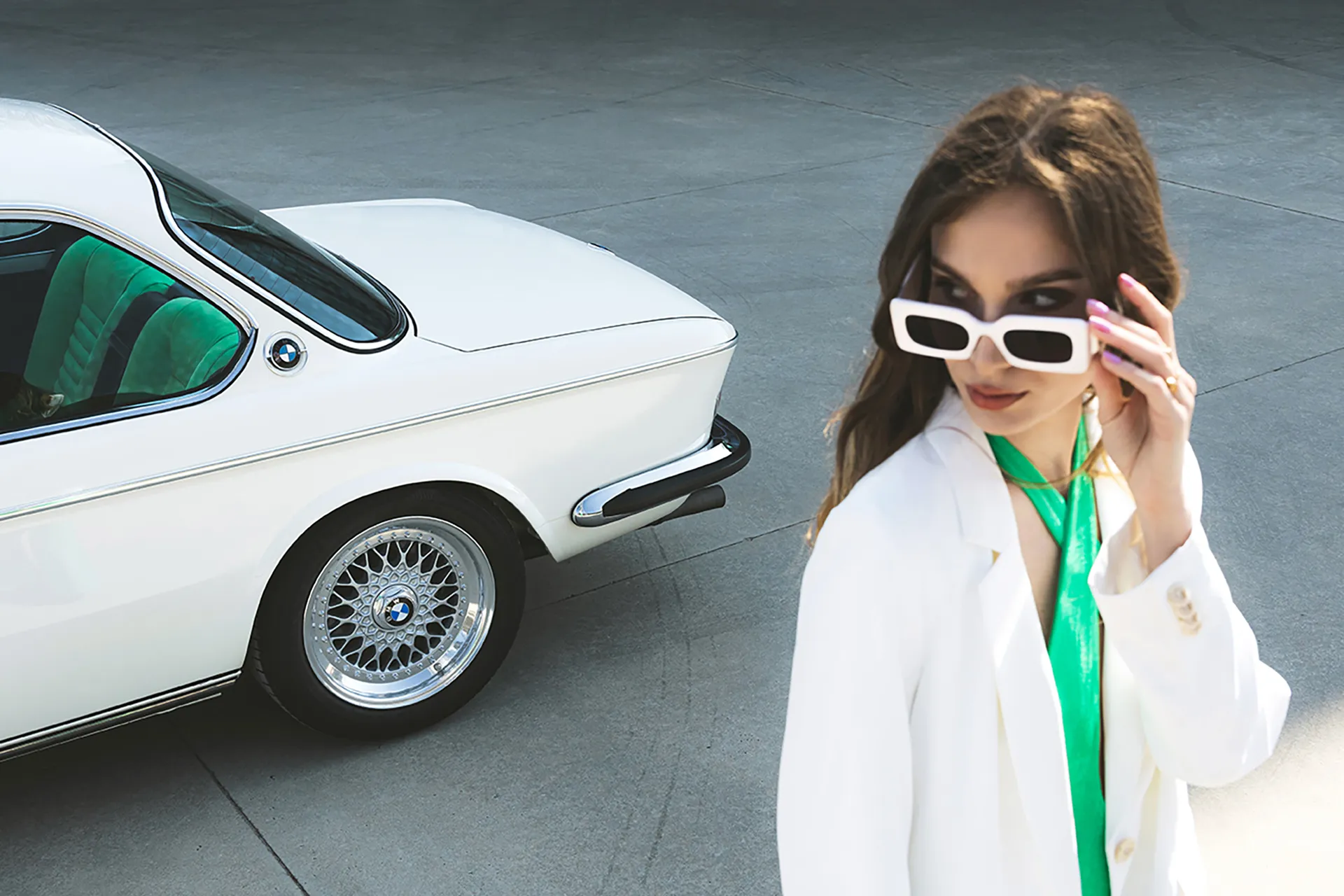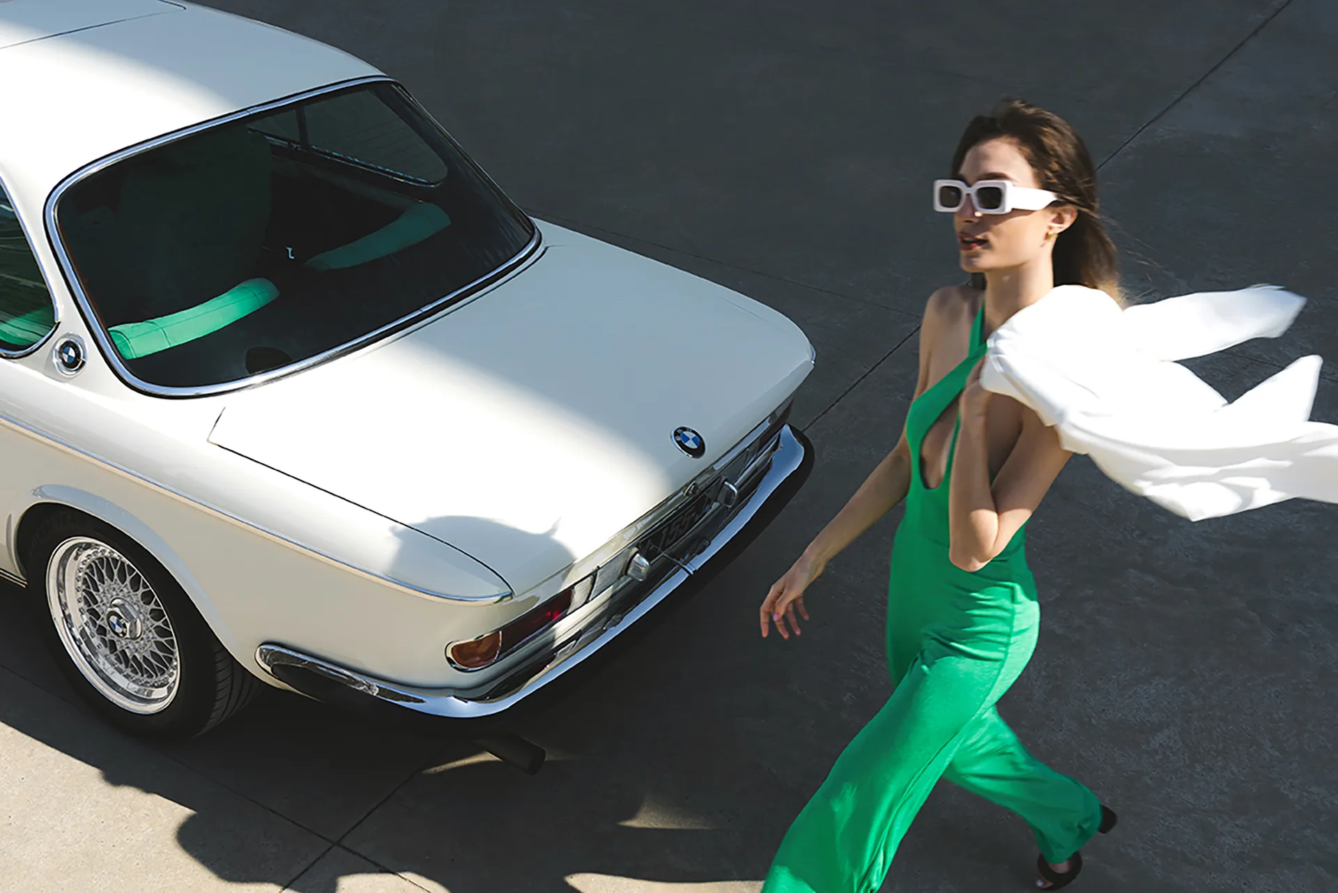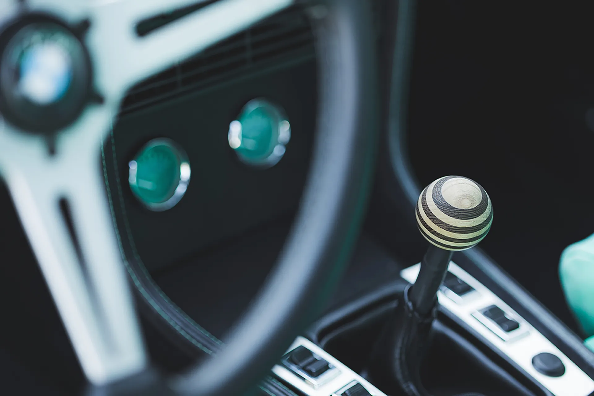 Brand: BMW | Model: 3.0 CS – E9 | Year: 1972 | Engine: 3.6L | Power: 315 HP | Weight: 1420 kg | Transmission: Manual | Color: Mythic White | Materials: Daim vert menthe, cuir noir et bois | Use: Daily