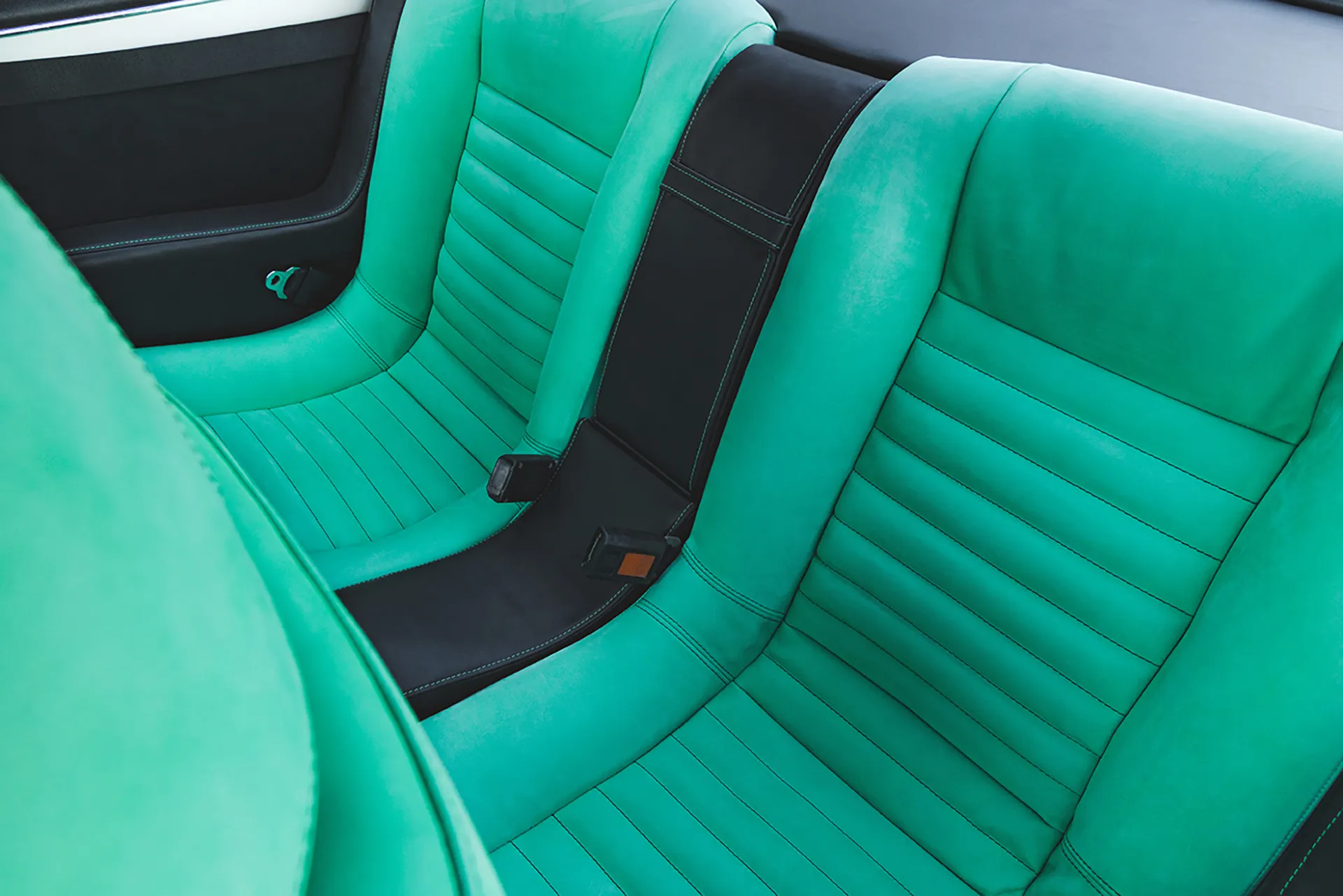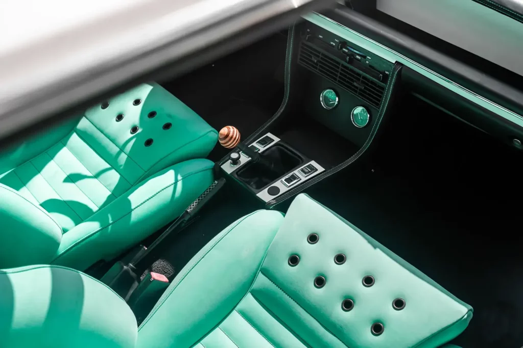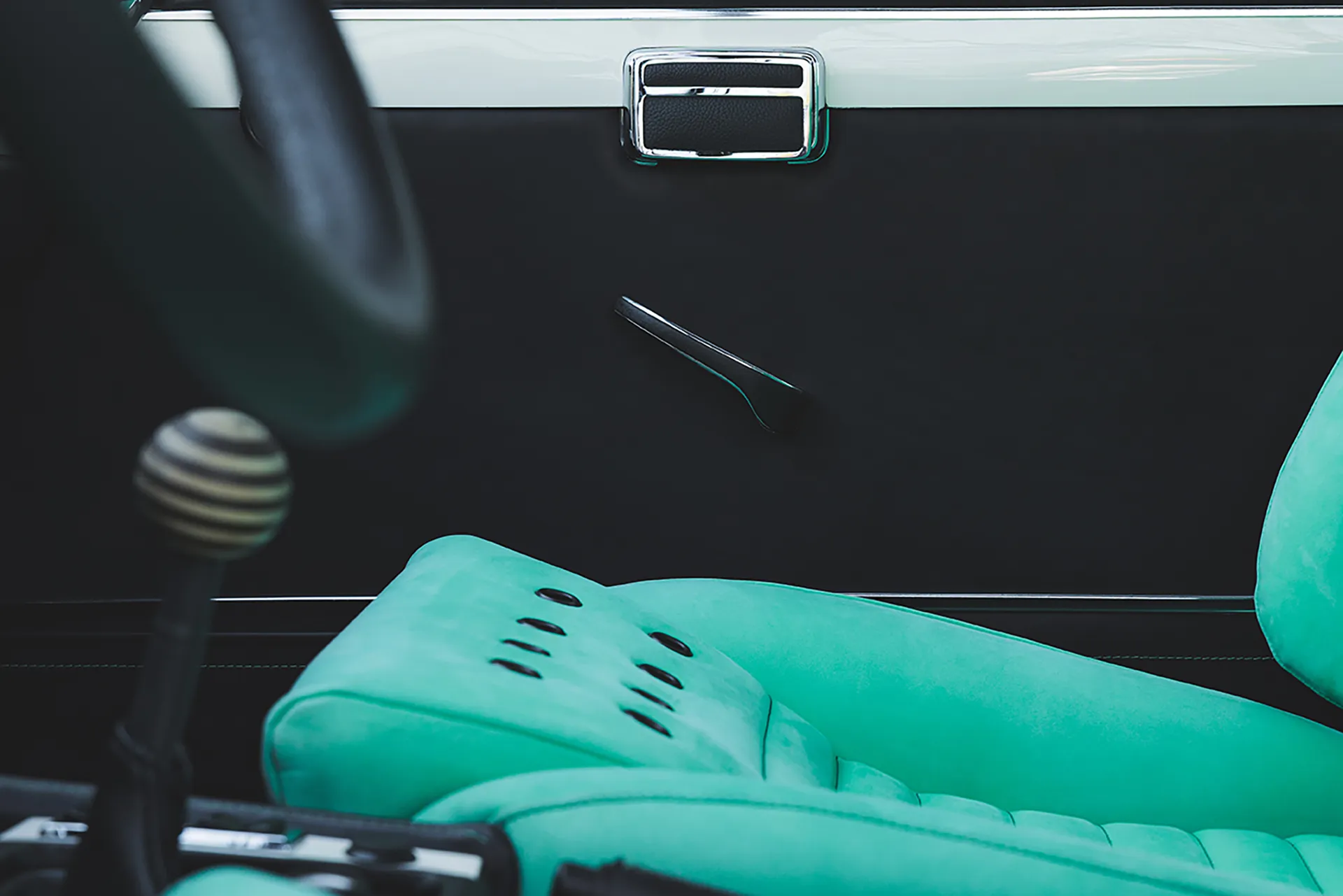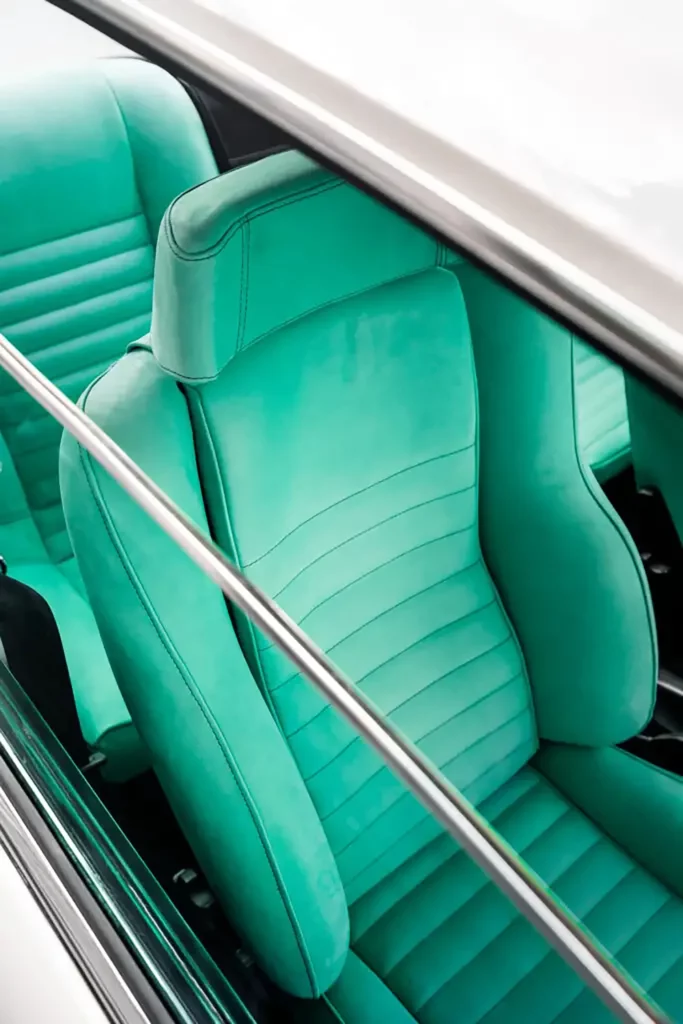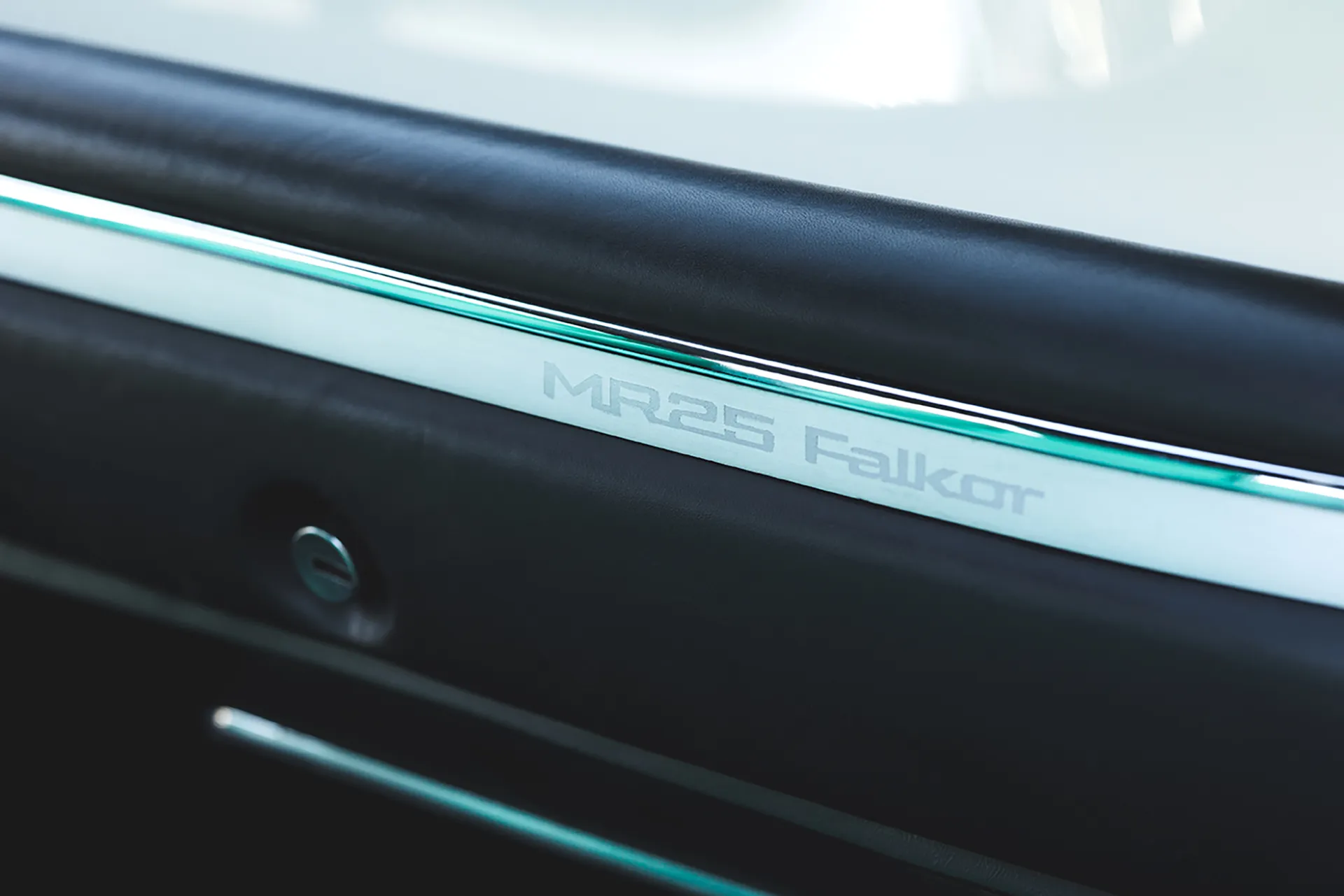 MR25 Falkorwears the flowing, timeless lines of the E9 coupé in bright Mythic White, accented with gleaming chrome. Inside, a custom mint green suede upholstery sets a tone of freshness and refined boldness. Every element has been bespoke-designed: fine stitching, deep carpets, wood accents, reimagined switchgear… together creating an interior both luminous and luxurious. In contrast to the raw edge often associated with restomods, FALKOR embraces elegance, poetry, and a sense of rare, understated luxury.