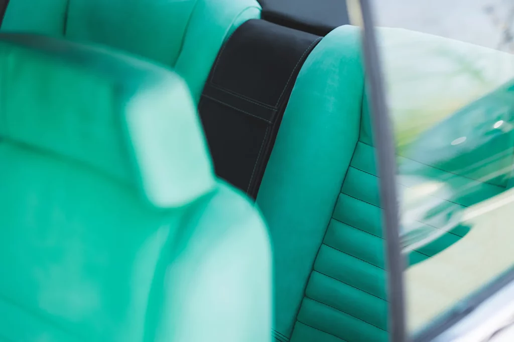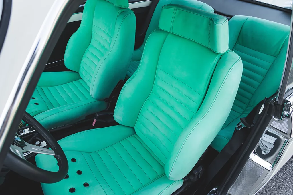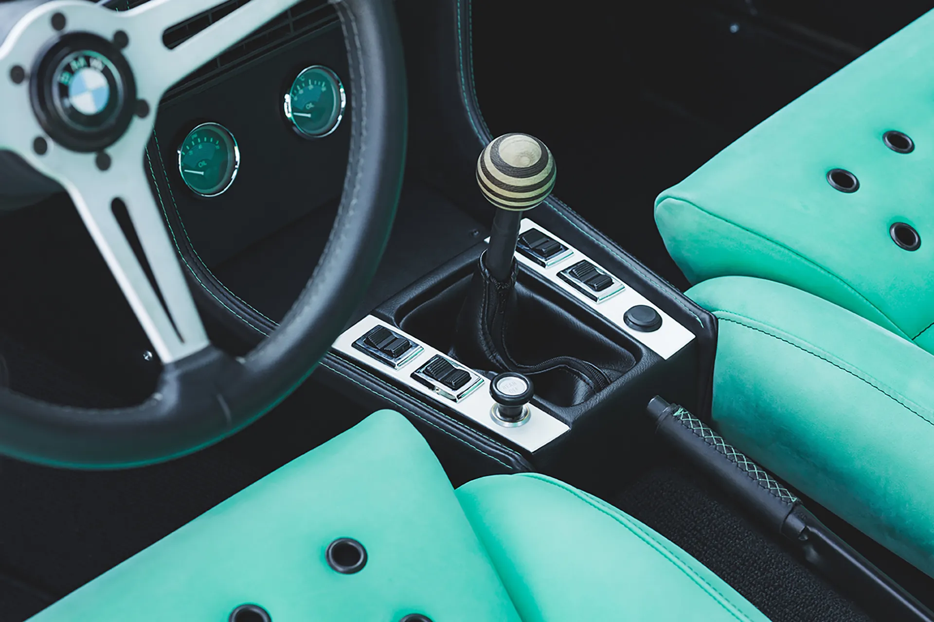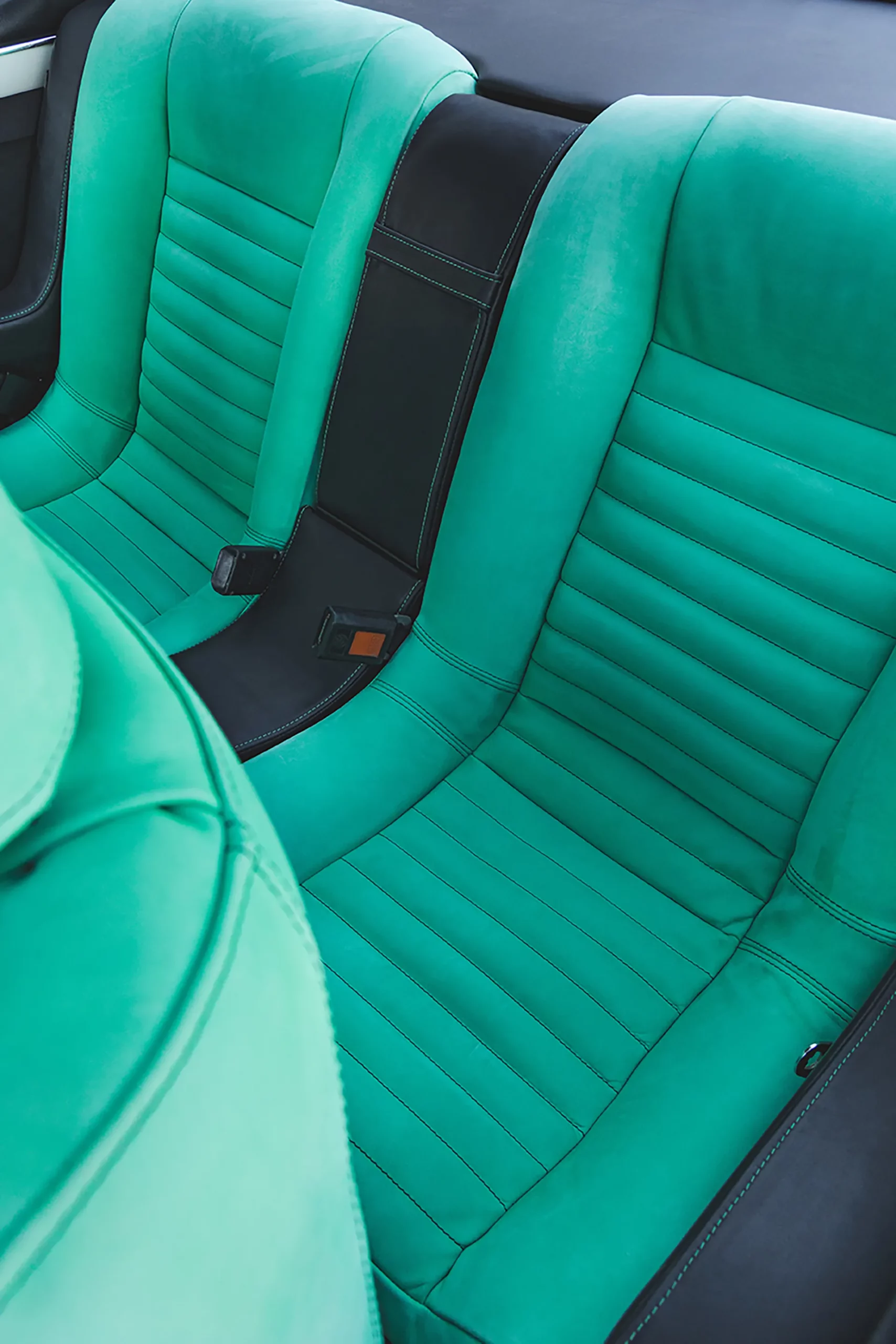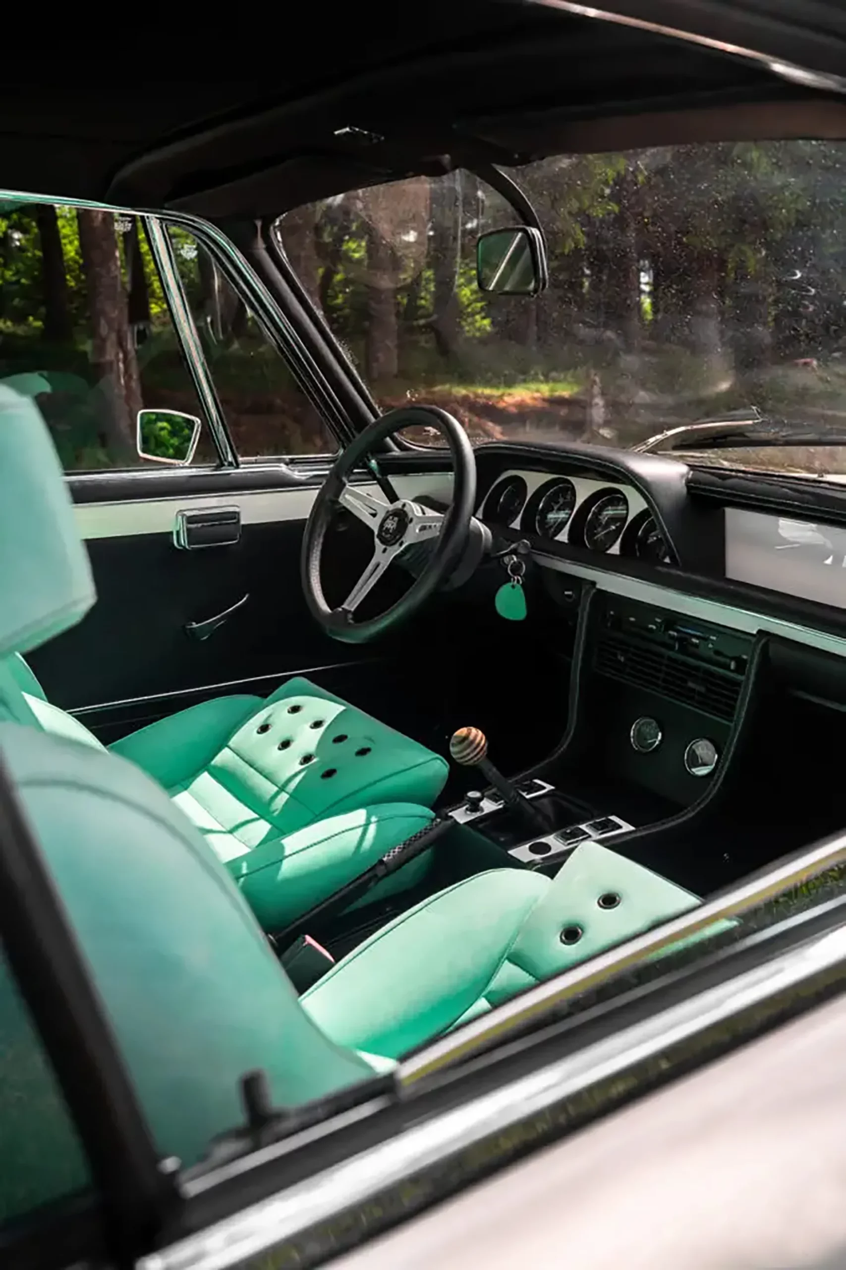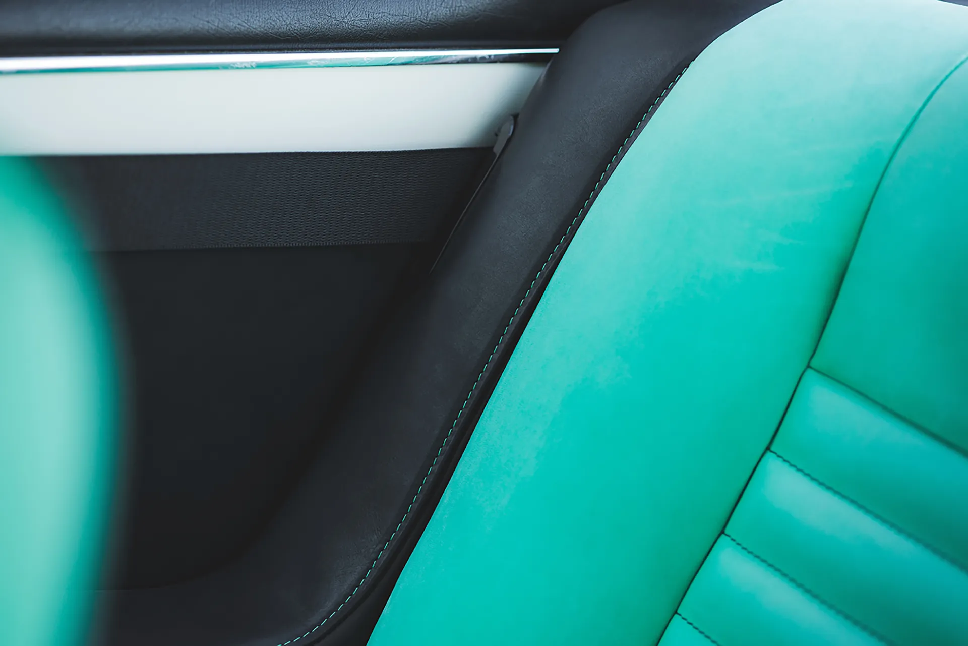 MR25 Falkorwears the flowing, timeless lines of the E9 coupé in bright Mythic White, accented with gleaming chrome. Inside, a custom mint green suede upholstery sets a tone of freshness and refined boldness. Every element has been bespoke-designed: fine stitching, deep carpets, wood accents, reimagined switchgear… together creating an interior both luminous and luxurious. In contrast to the raw edge often associated with restomods, FALKOR embraces elegance, poetry, and a sense of rare, understated luxury.