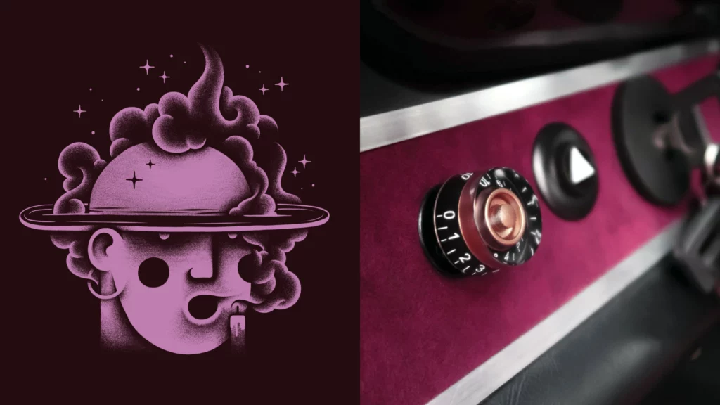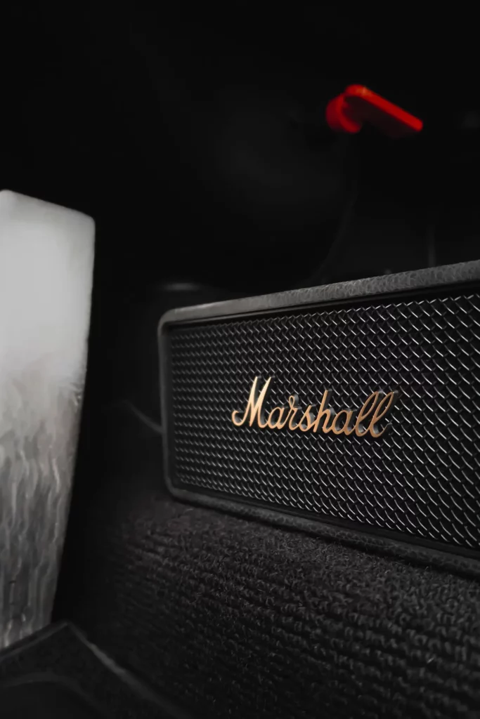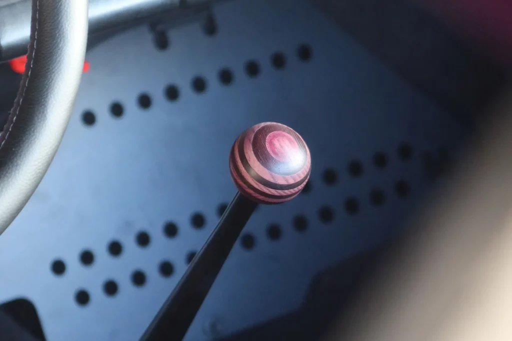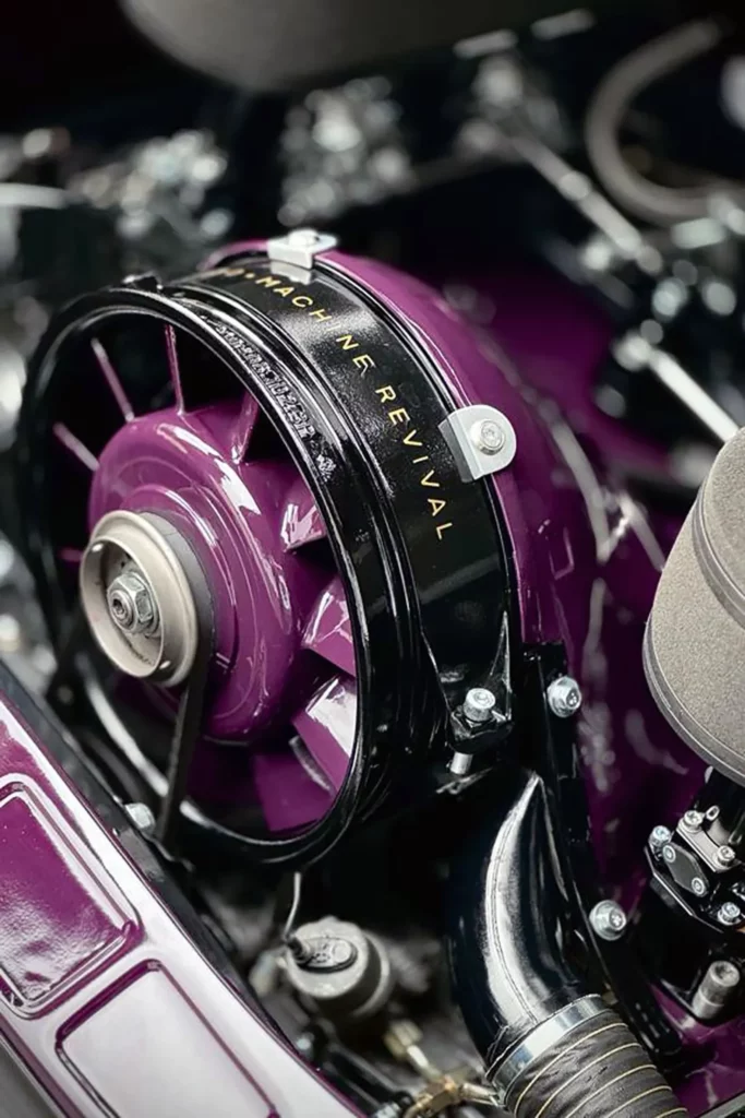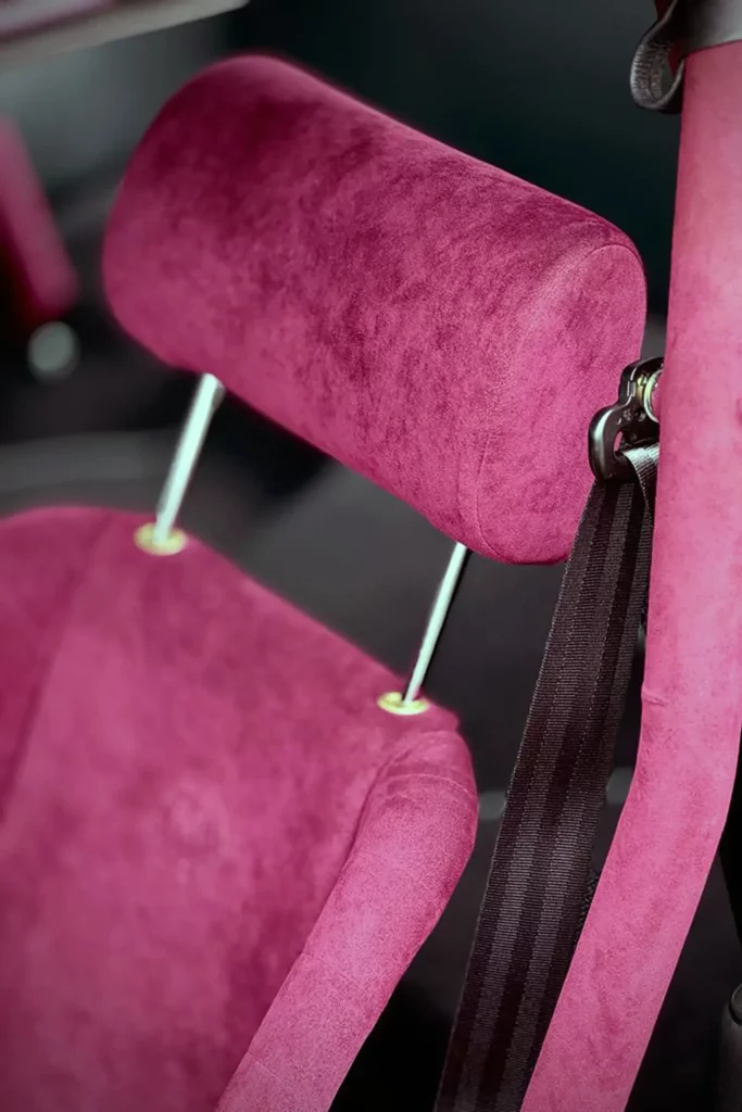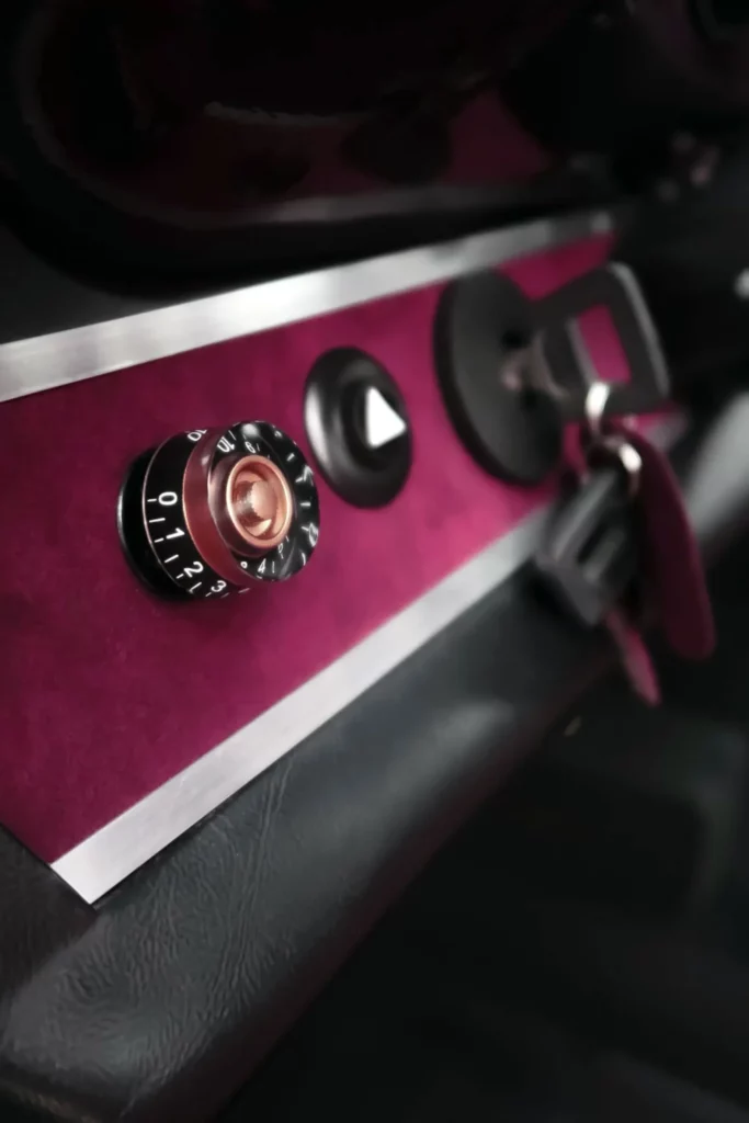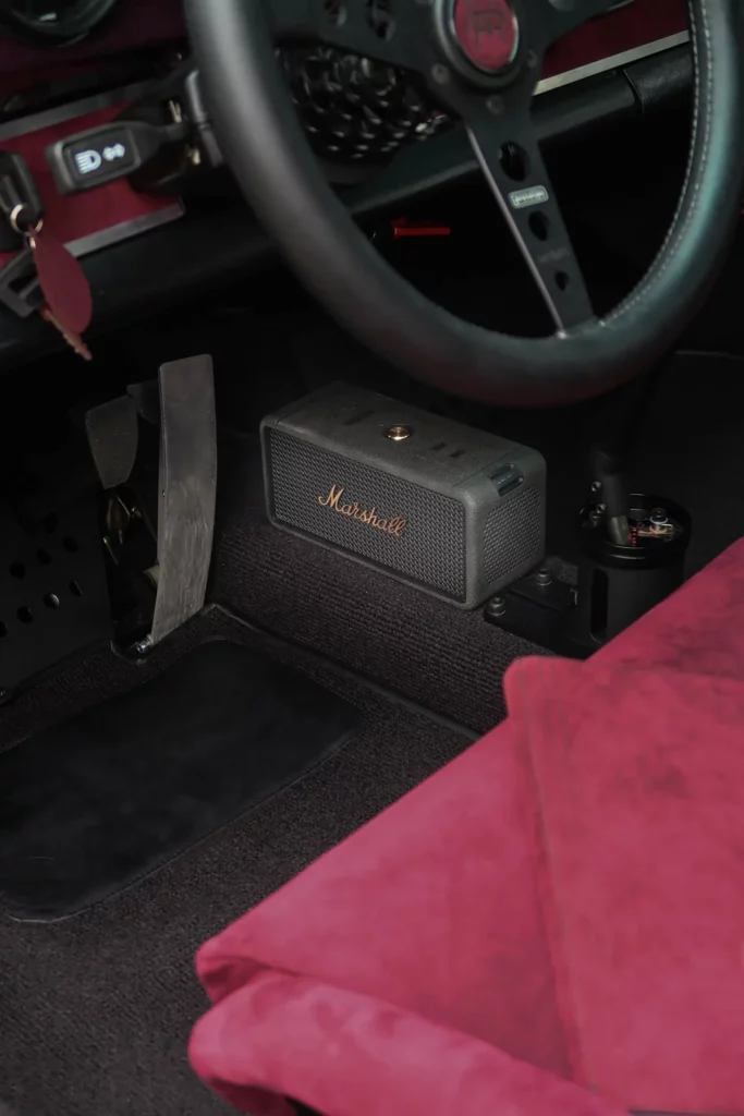 Its Slash Purple paint shifts like the winter sky, casting fiery or icy tones depending on the light. Subtle yet striking, MR30 Orion stands out with gold aluminum wheels, perforated door handles, and yellow headlights — details that nod to a rebellious, rock-inspired aesthetic. Inside, the atmosphere feels like a backstage dressing room: deep purple Alcantara stretched across the seats, dash, and roll cage, accented by iconic seat grommets, custom-made guitar-style knobs, a turned wood shifter, and a three-spoke steering wheel. Every element has been composed to resonate — visually, materially, emotionally.