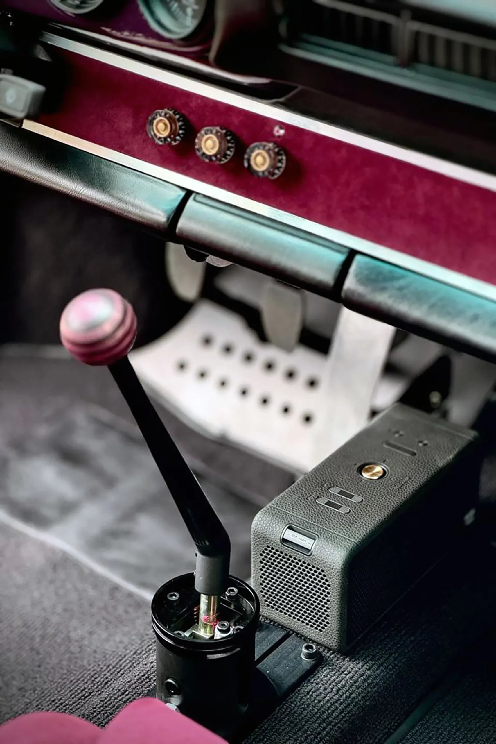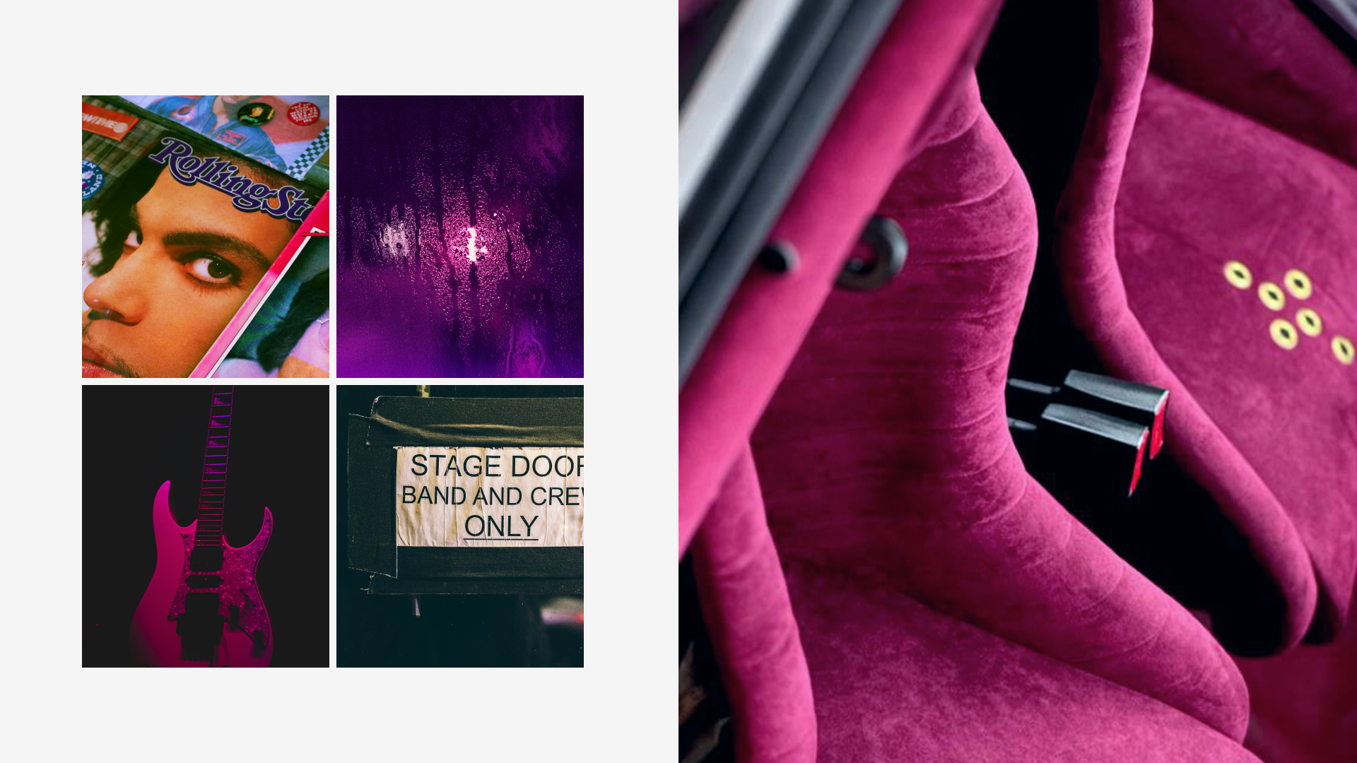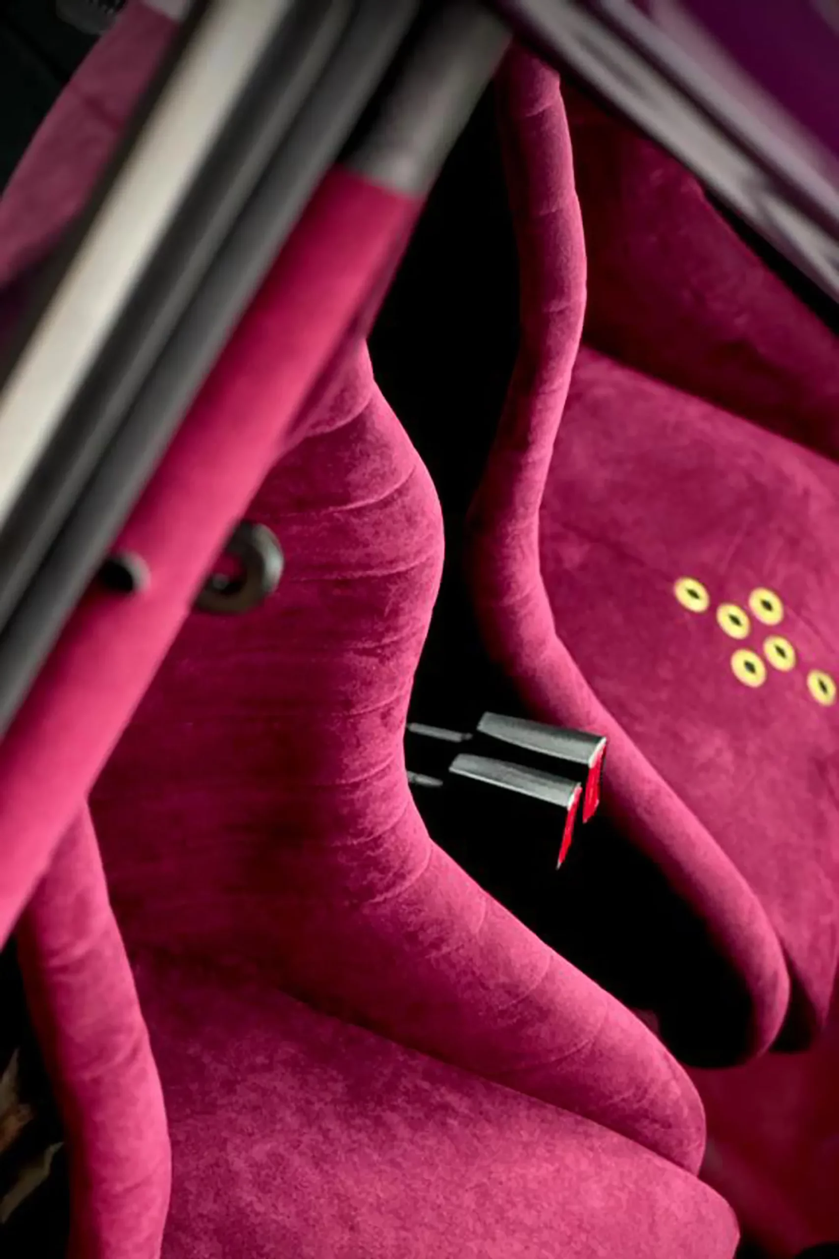 Its Slash Purple paint shifts like the winter sky, casting fiery or icy tones depending on the light. Subtle yet striking, MR30 Orion stands out with gold aluminum wheels, perforated door handles, and yellow headlights — details that nod to a rebellious, rock-inspired aesthetic. Inside, the atmosphere feels like a backstage dressing room: deep purple Alcantara stretched across the seats, dash, and roll cage, accented by iconic seat grommets, custom-made guitar-style knobs, a turned wood shifter, and a three-spoke steering wheel. Every element has been composed to resonate — visually, materially, emotionally.